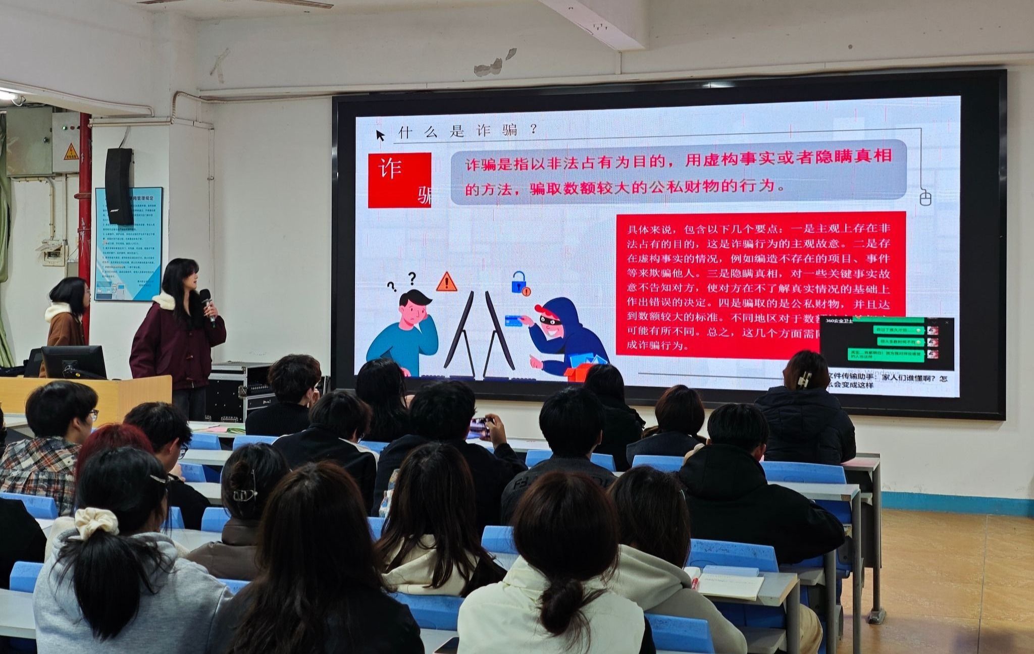 学生会打破单一宣传模式,以“专业力量+学生参与”搭建反诈服务框架。一方面,联合晋江市公安局内坑派出所、内坑镇综治中心建立“警院共建”机制,邀请刑事侦查大队杨煜煌警官、内坑派出所傅宝昌民警等入校宣讲,累计开展“保障权益防风险,守护平安青春行”等专题讲座8场,覆盖学生超3000人次;另一方面,以学生会主要干部为成员组建四实书院反诈志愿宣讲团,聘请3名公安骨干为导师,通过“案例拆解+情景模拟”培养52名学生宣讲骨干,形成“民警领学、学生传学”的服务闭环,让反诈服务既有专业支撑,又有青春温度。