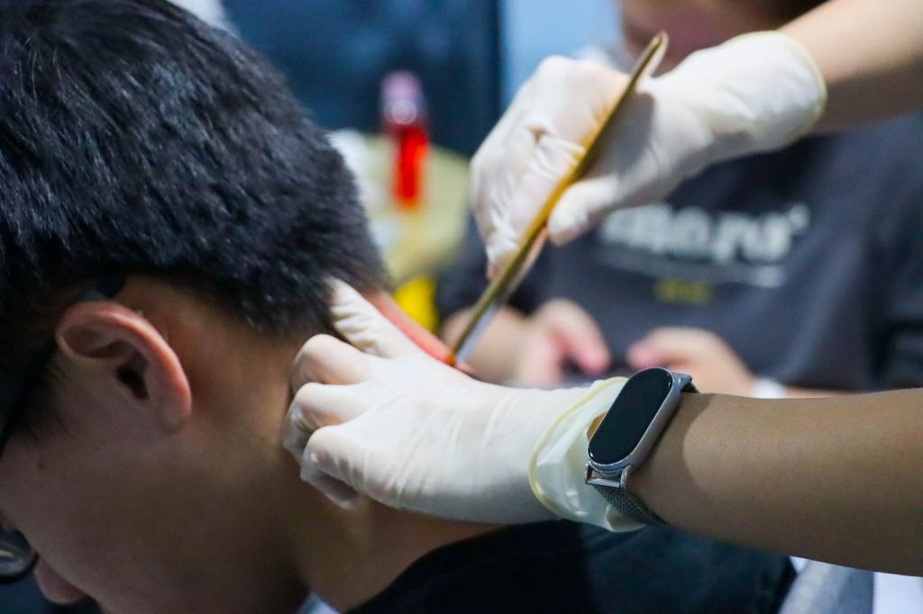 在传统中医治疗体验区,推拿、耳穴埋豆、针灸和拔罐项目等同样人气爆棚。通过现场体验,师生们对这些古老的治疗方法有了更加直观的认识,并对其显著的疗效给予了高度认可。