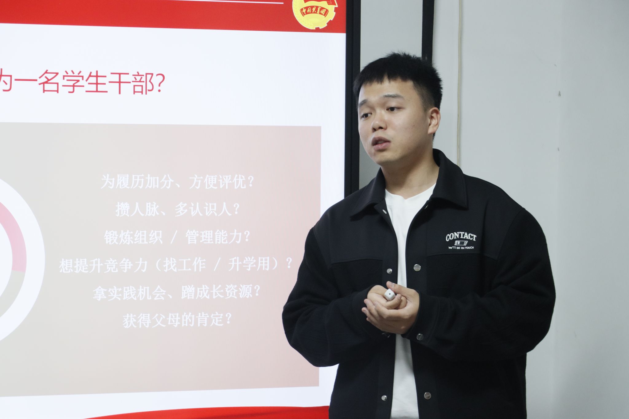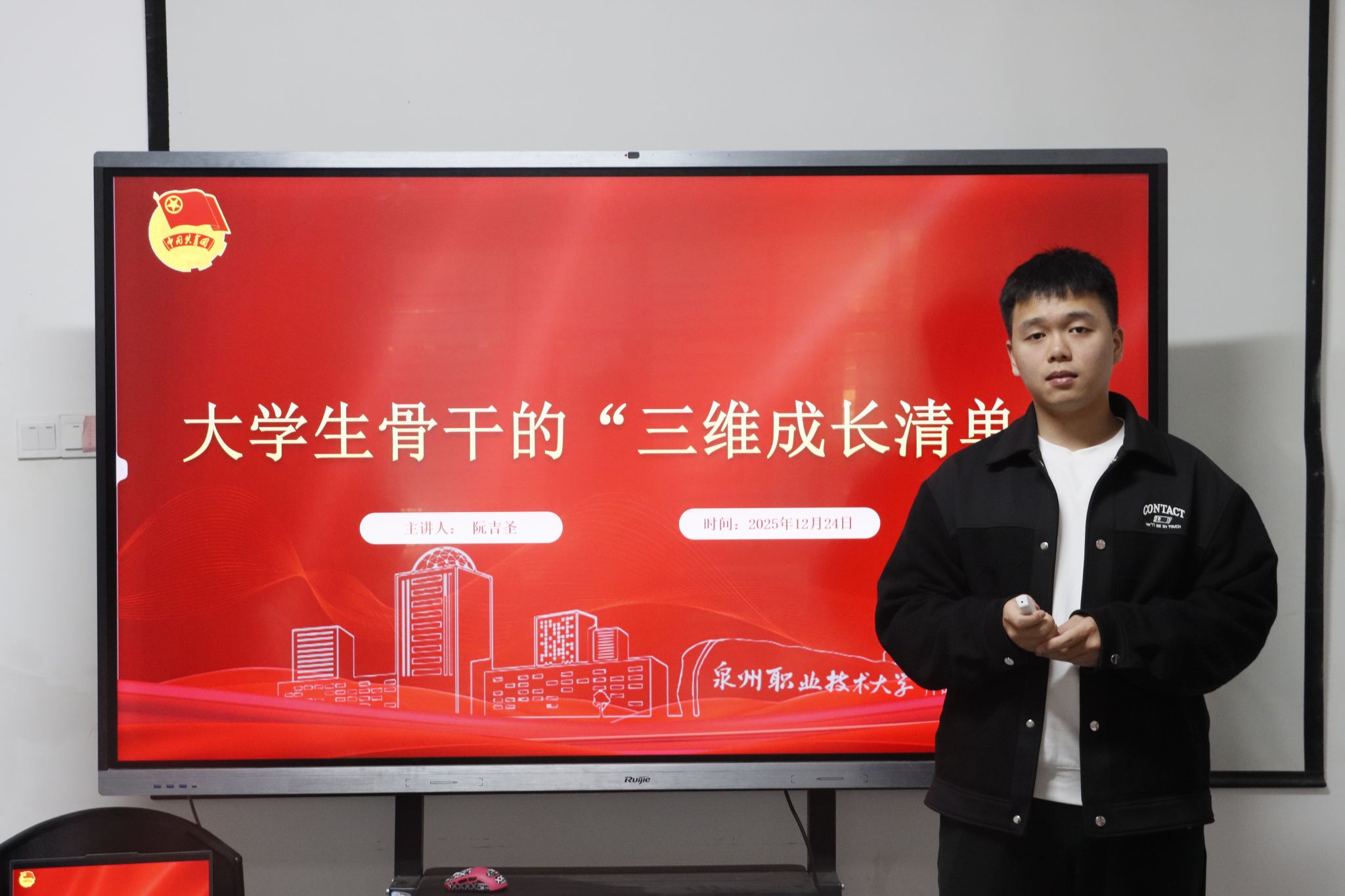 分享之初,阮吉圣学长结合自己亲身经历,分享了自己从四实书院2020级软件工程技术专业团支书,到四实书院团委副书记,再到泉州职业技术大学团委副书记,再后来留校担任思政辅导员、团委书记的成长历程。这份从“书院学生”到“青年引路人”的角色蜕变,让在场同学心生向往与敬佩。他用亲身经历诠释“笃行方致远,初心照前路”,为学弟学妹们的成长成才树立了生动榜样。