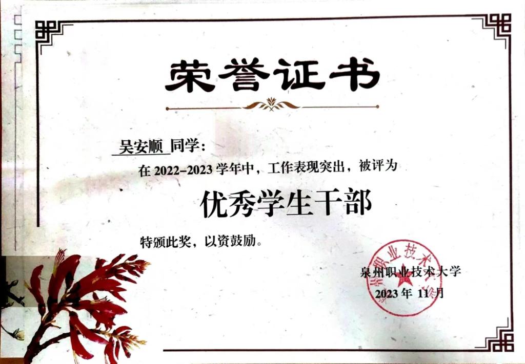 与此同时,在担任磁灶镇东山村兼职团干期间,协助村支部书记开展“与爱童行,章印东山”六一主题等相关活动,充分发挥“螺丝钉”作用,带领团队成员走访调研,准确把握团员和青年思想政治引领工作的高度、角度和温度。他组织开展“非遗进校园,文化共传承”传统文化系列活动、“从馨启航,灼灼溢光”双馨之夜等品牌活动,搭建书院与学生的沟通桥梁,赋能学生多维成长;积极投身社会实践,作为项目负责人,曾带队到晋江、石狮开展红色影子社会实践;发挥主人翁作用,实地调研校园,发表关于解决面试环境尴尬,缓解“出声”困扰,增设“静语亭”的提案;利用寒暑假深入企业进行学习,彰显青春风采,参加全友家居2023年度整家交付安装技能提升培训中荣获“优秀个人奖”。
