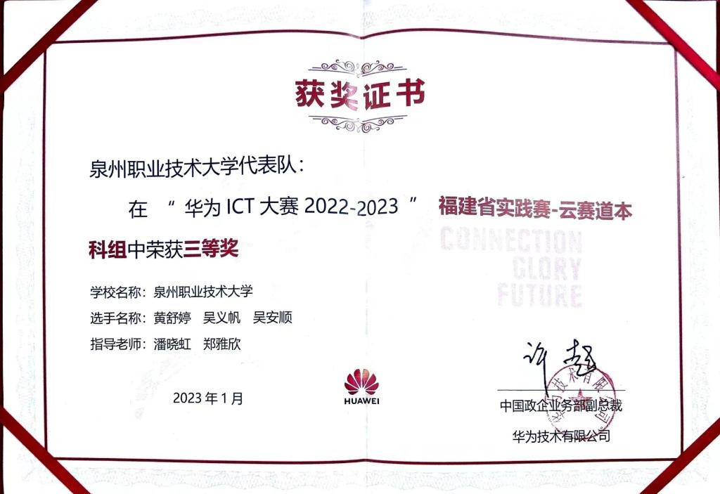 2023年01月 华为ICT大赛福建省实践赛云赛道本科组三等奖