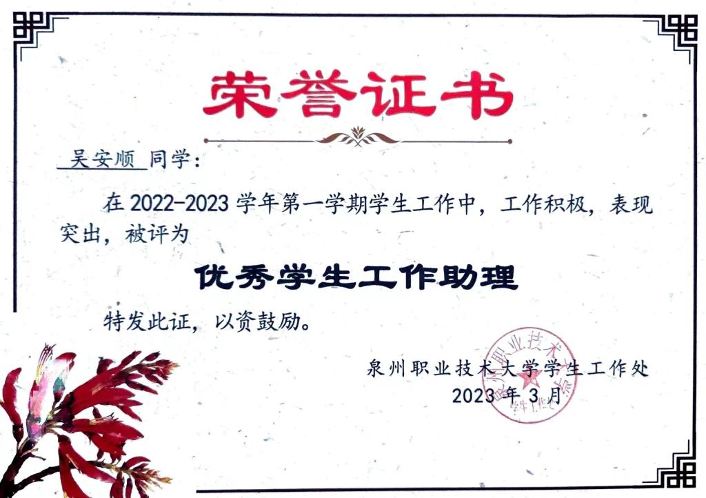 吴安顺,男,汉族,2002年11月生,泉州职业技术大学联合创新产业学院软件工程技术专业2021级本科生,汉族,中共党员。现任泉州职业技术大学招生办公室实习生。曾获国家励志奖学金;“泉州市三好学生”称号;第五届全国大学生语言文学能力大赛初赛非专业组三等奖、华为ICT大赛福建省实践赛云赛道本科组三等奖,连续两年蝉联海峡两岸暨港澳大学生职业技能大赛数智化运营与管理赛项本科组团体奖一等奖。积极投身大学生社区实践计划,作为磁灶镇兼职团干带领团队在东山村等5个村落开展实地调研,围绕文化传承与创新、乡村教育提升、生态旅游发展等方面落地23场活动,覆盖服务人群达到8000余人,充分发挥兼职团干引领作用。