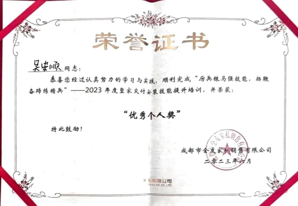 2023年06月 成都市全友家私销售有限公司全友家居优秀个人奖