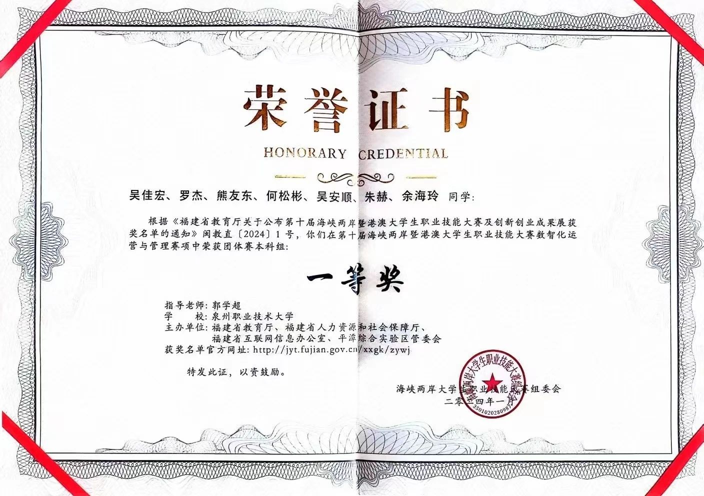 2024年01月 第十届海峡两岸暨港澳大学生职业技能大赛数智化运营与管理赛项本科组团体奖一等奖