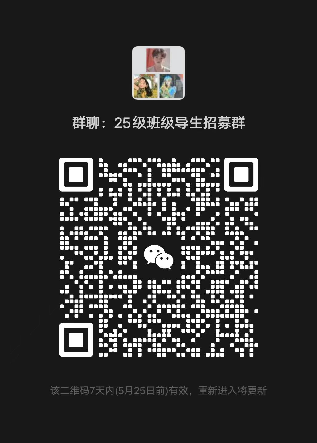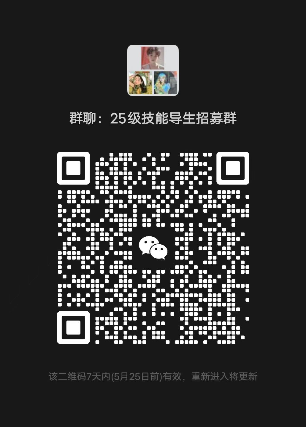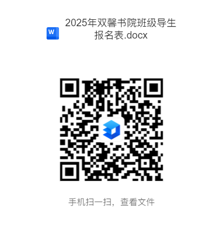 有意应聘者详细填写报名表(文末下载)并提供相关佐证材料,于5月24日12:00前一并发送至邮箱(3119434804@qq.com),邮件主题及文件夹名称均为:2025级班级导生/技能导生——班级姓名(例:2025级班级导生——23应化1班张三)。有意向报名的同学请扫描下方二维码加入微信群,以便后续相关事项通知。