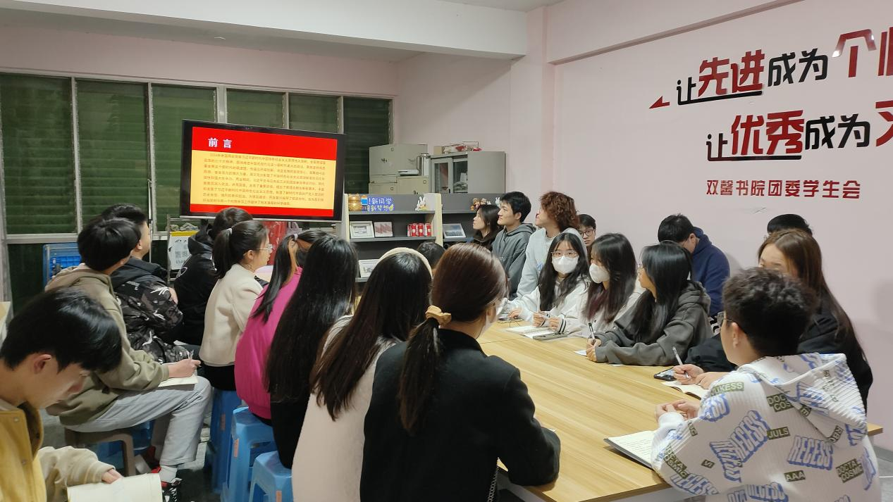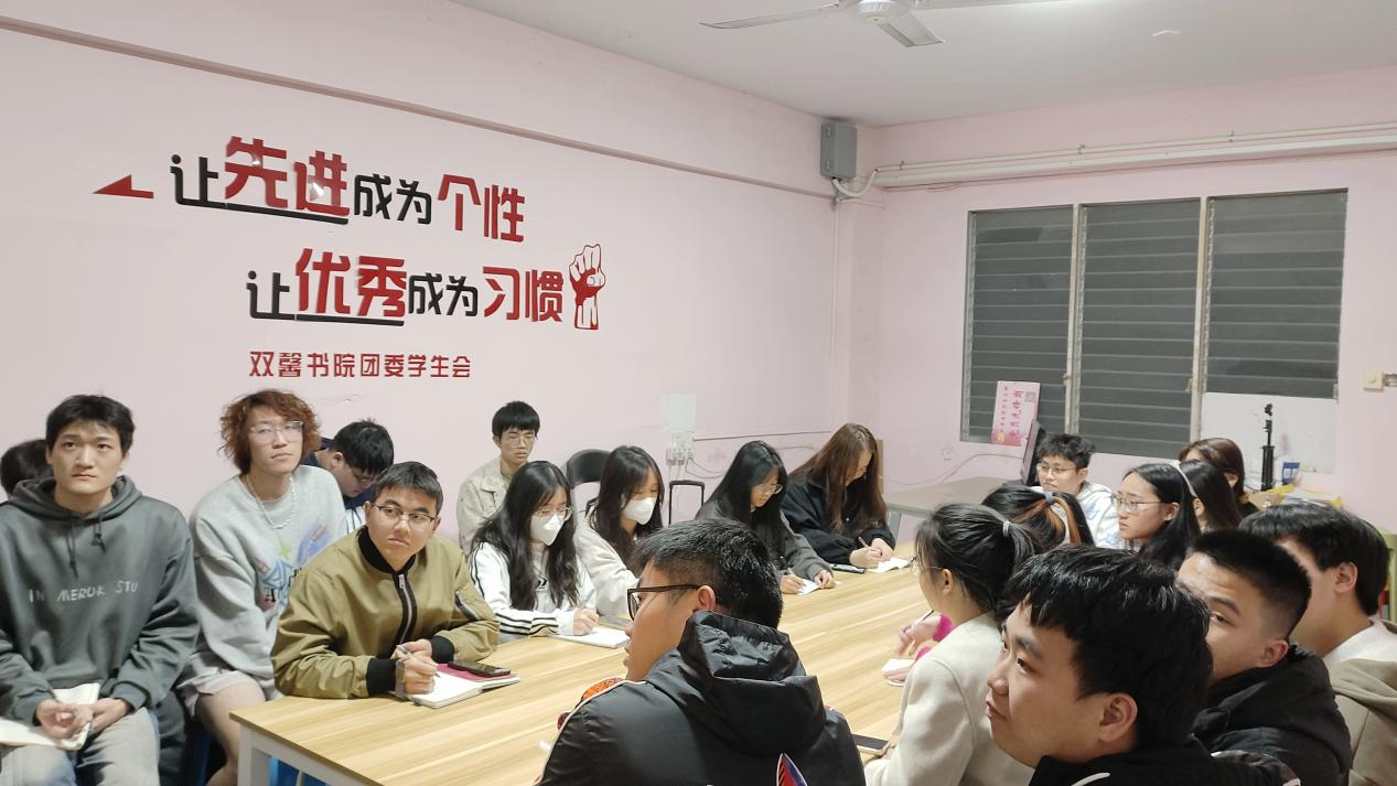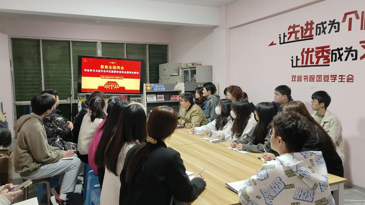 为深入学习贯彻两会精神,进一步感悟青年使命,践行青年担当,提升团员青年的政治素养,2024年3月13日,双馨书院团委面向书院团员和青年开展学习聚焦全国两会精神,传达习近平总书记重要讲话的专题学习会。