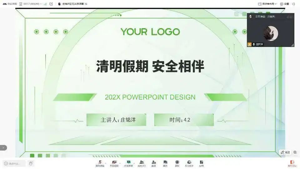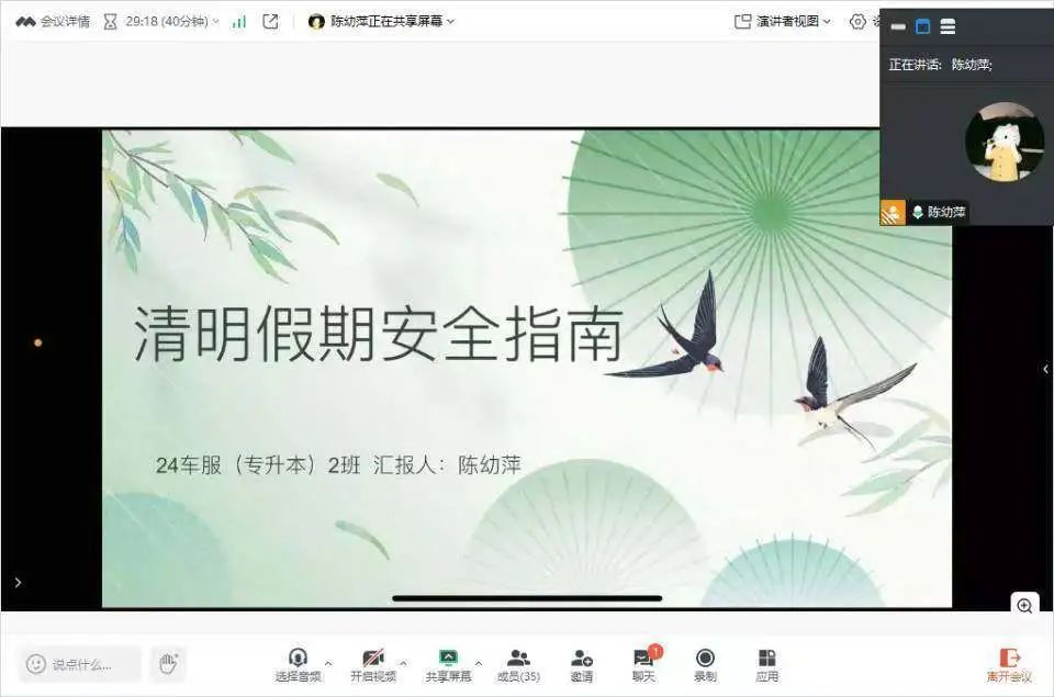 清明节作为中华民族传统节日,承载着深厚文化内涵。然而,每逢节假日,学生出行频次增加,面临的安全风险也随之上升,诸如交通意外、旅游安全隐患、网络诈骗等问题层出不穷。为了向同学们普及清明假期各类安全知识,提升大家的安全防范意识和自我保护能力,引导大家在享受假期的同时保持警惕。特此,双馨书院通过线上的形式,开展“清明假期,安全相伴”主题班会,营造平安和谐的校园环境、保障同学们度过一个欢乐安全的清明假期。