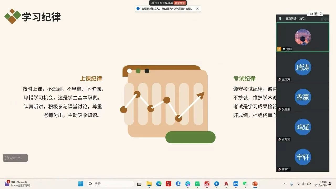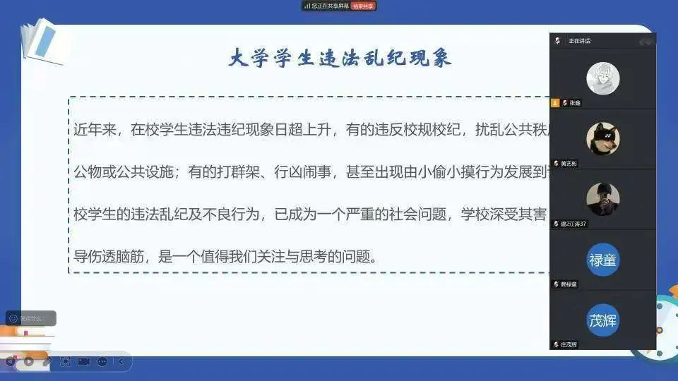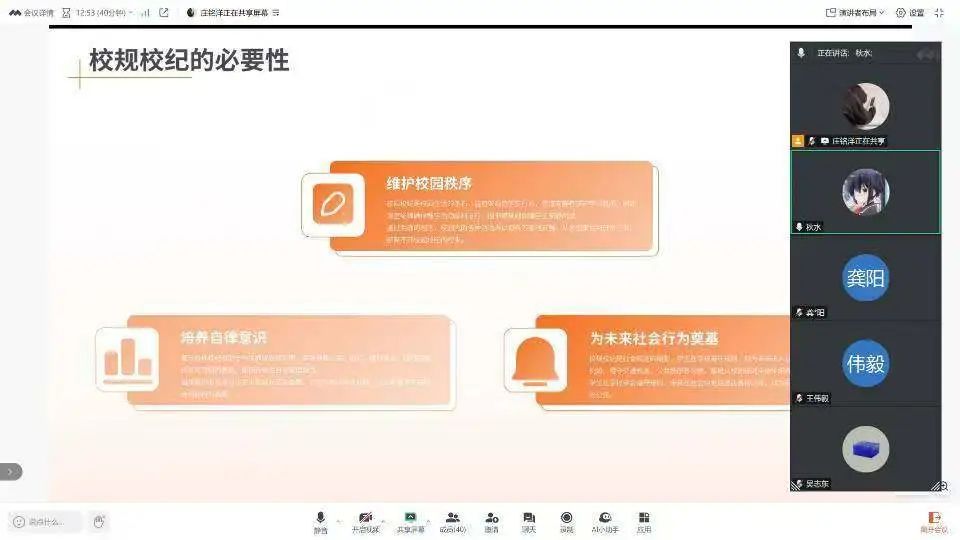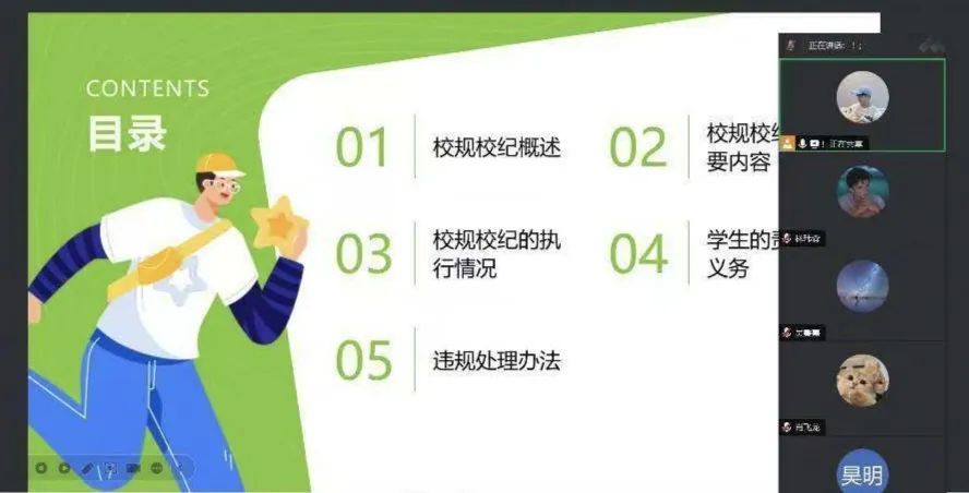 在校园生活中,校规校纪就如同指引我们前行的明灯和约束行为的准绳。然而,部分同学对校规校纪的理解还不够深入,甚至存在一些违反校规校纪的现象,这不仅影响了个人的成长与发展,也破坏了班级乃至学校的良好秩序。为了进一步增强同学们对校规校纪的知晓度和敬畏感,引导大家将校规校纪内化于心、外化于行,自觉遵守校规校纪,培养良好的行为习惯和道德品质。特此,双馨书院通过线上的形式,开展“校规校纪知与行”主题班会,营造一个和谐、有序、文明的校园环境。