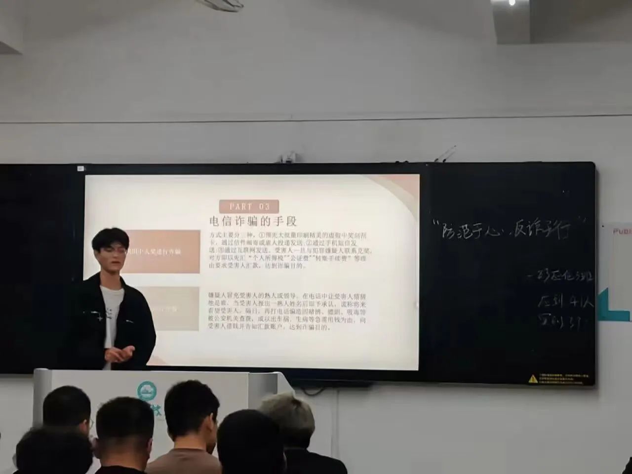 本次主题班会中,各班分别通过演讲和观看相关视频等形式加深对电信网络诈骗的内容的印象和提升学生的防诈骗意识和能力。