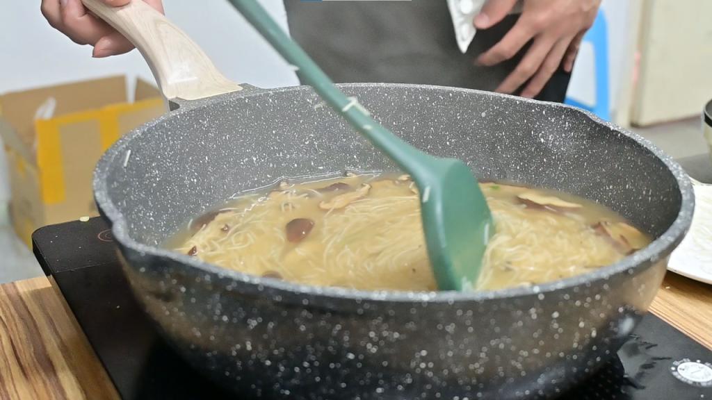 起锅热油,放入香菇翻炒,加入葱花、适量胡椒粉,适时将精制面线稍捻碎放入沸汤锅中,加入精盐、味精调准味。倒入红薯水淀粉,开始慢熬,淀粉调水徐徐舀入锅中,并不停推勺至面线浮起,锅中汤汁成糊状。