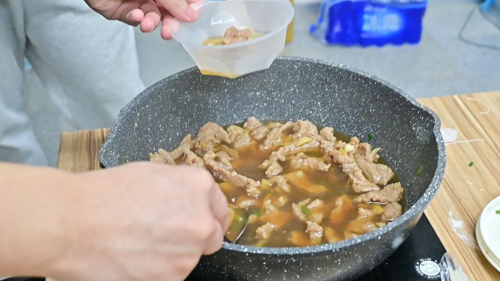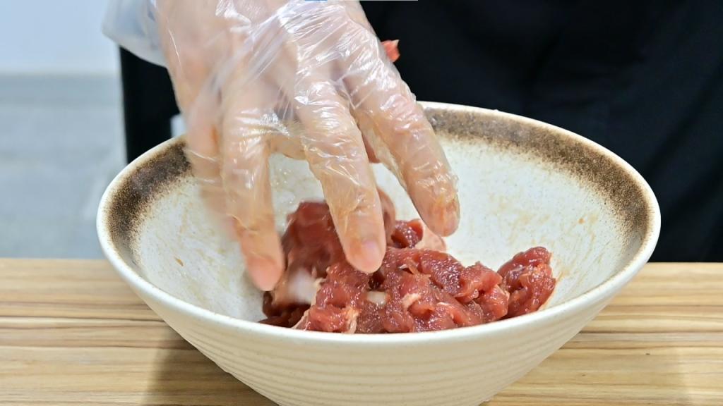 把牛肉切成条状,放入碗中,在碗中加入淀粉、生姜、少许水、调好比例的酱油食用碱,经反复揉打1.5小时,帮助牛肉口感更上一层,中间不能停,不然牛肉会发硬。在成员的抓打完成后逐坨放入牛肉在锅内搅拌,转至大火将汤烧沸待牛肉漂浮即可关火停煮,爽滑软嫩的牛肉羹出锅啦。