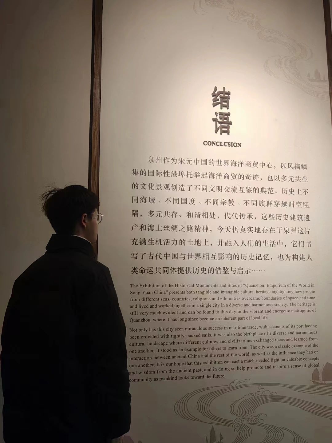 1月19日,实践团成员来到了泉州海外交通史博物馆。泉州海外交通史博物馆是一部生动的历史教科书。这座博物馆展示了泉州在海上丝绸之路中的重要地位,以及与世界各地的贸易往来。在那里,实践团成员们看到了许多珍贵的文物和历史资料,它们将泉州在海上丝绸之路上的重要地位展现得淋漓尽致。这些文物见证了泉州海外交通的辉煌历史,让我们对这座城市的文化底蕴有了更深的认识。通过这些展品,我们对泉州的海外贸易、文化交流有了更深入的了解,也感受到了泉州人民开放的精神和创新的意识。