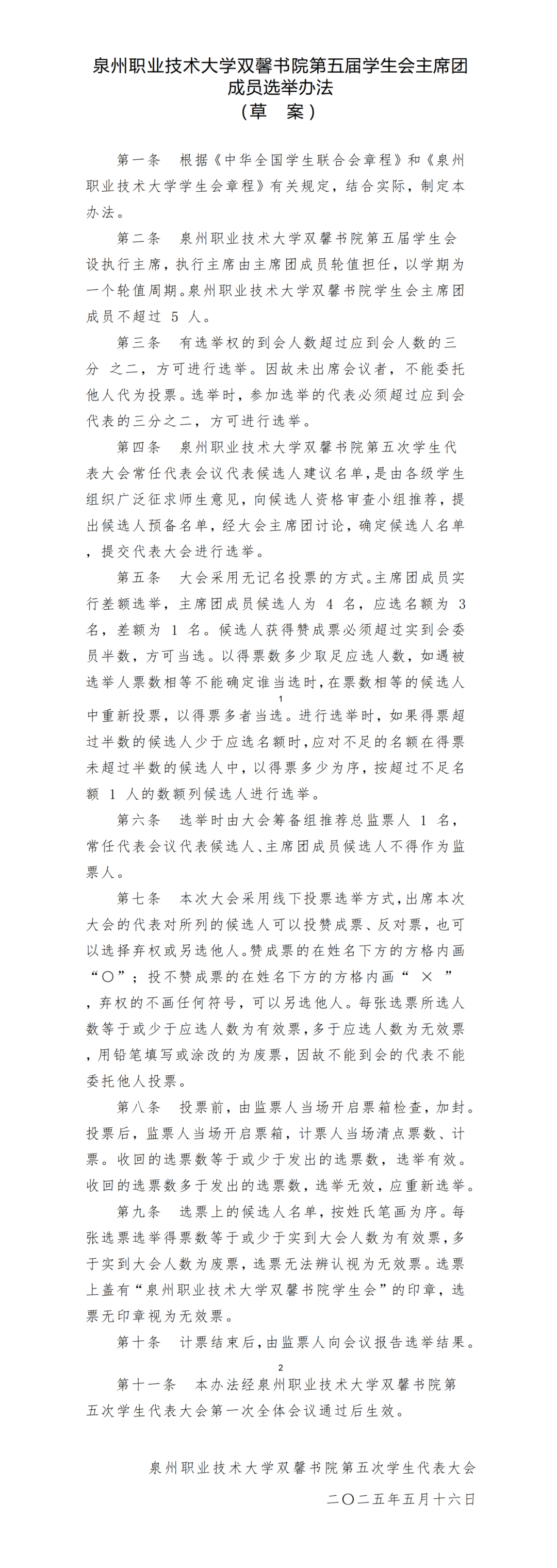 泉州职业技术大学双馨书院学生会主席团成员选举办法
