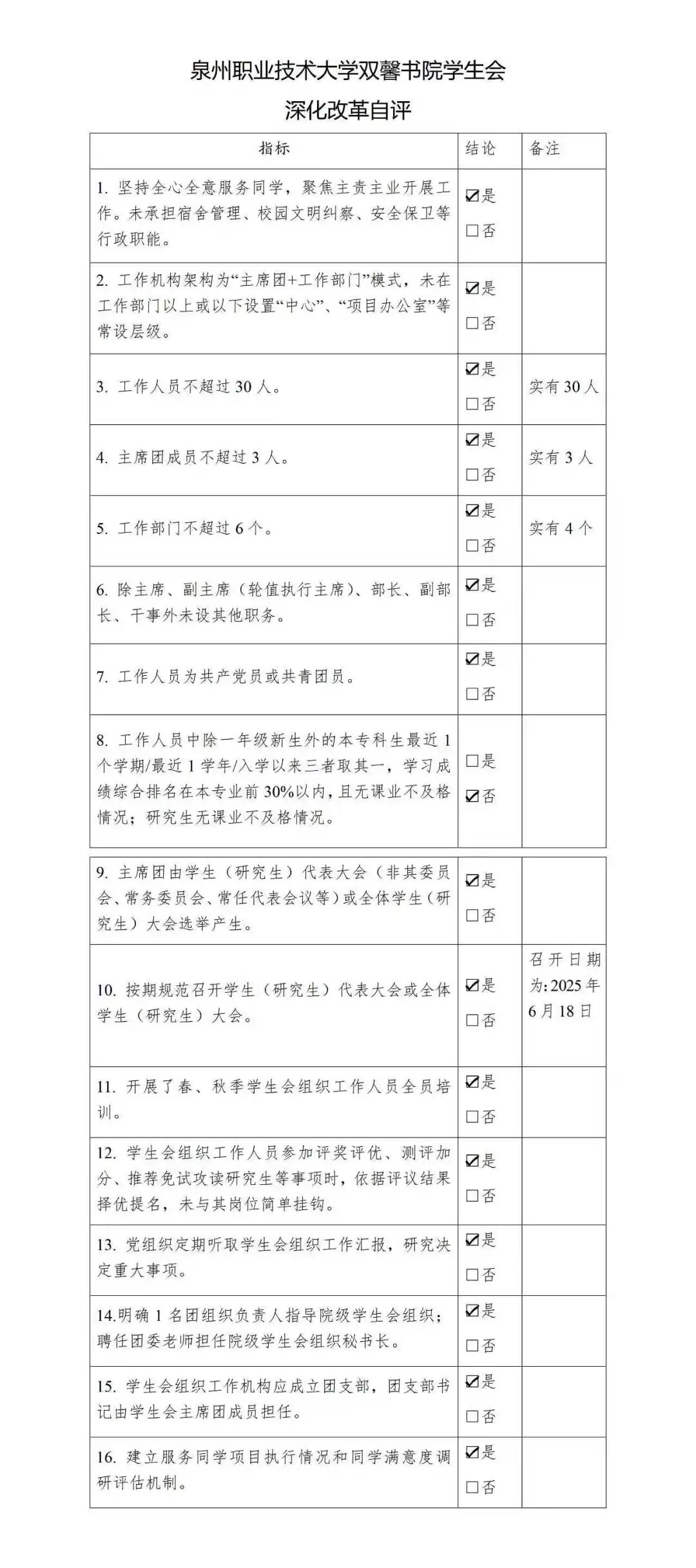 为贯彻执行共青团中央、教育部、全国学联联合印发的《关于推动高校学生会(研究生会)深化改革的若干意见》,并落实《关于巩固高校学生会(研究生会)改革成果的若干措施》的相关要求,同时主动接受广大师生的监督,现特将泉州职业技术大学双馨书院学生会改革情况公示如下: