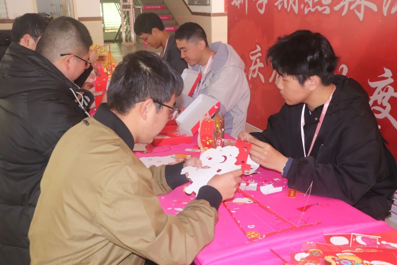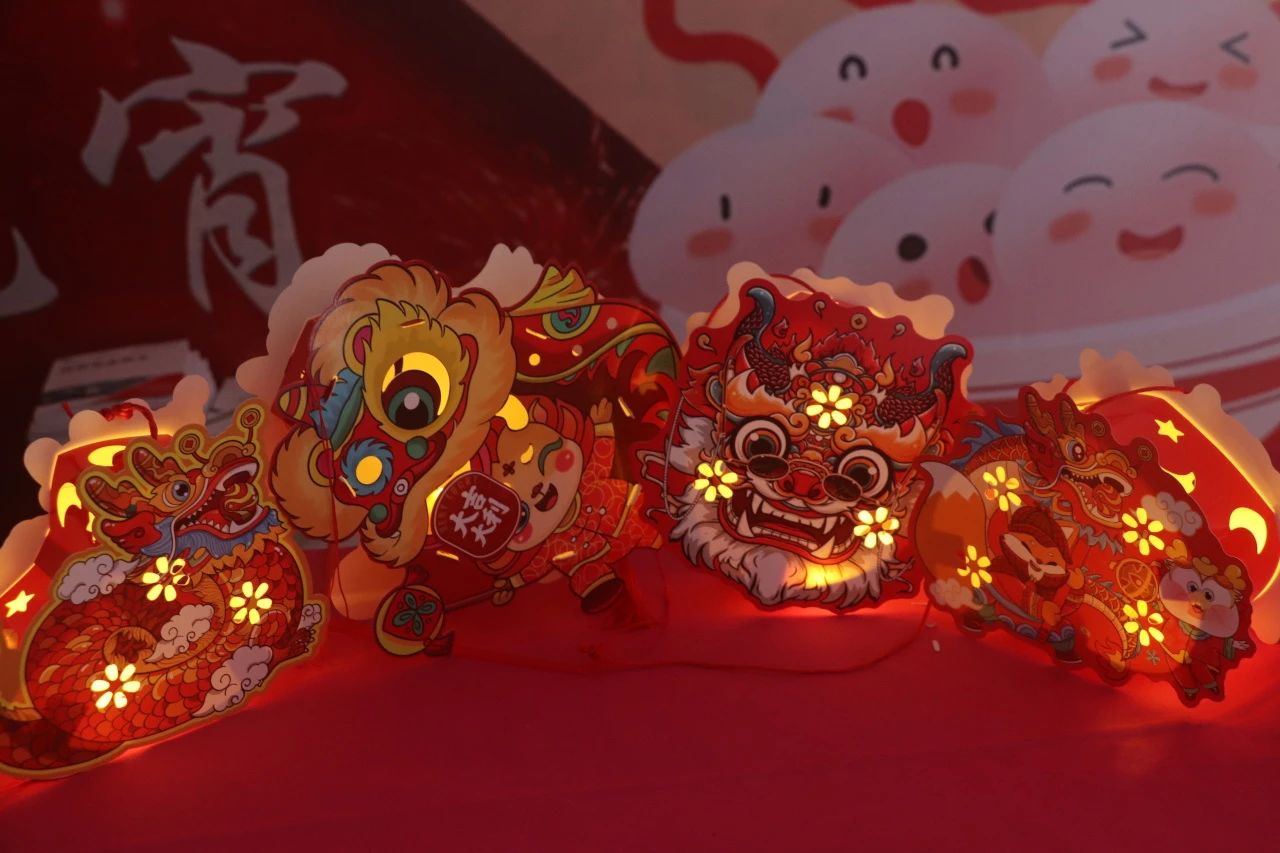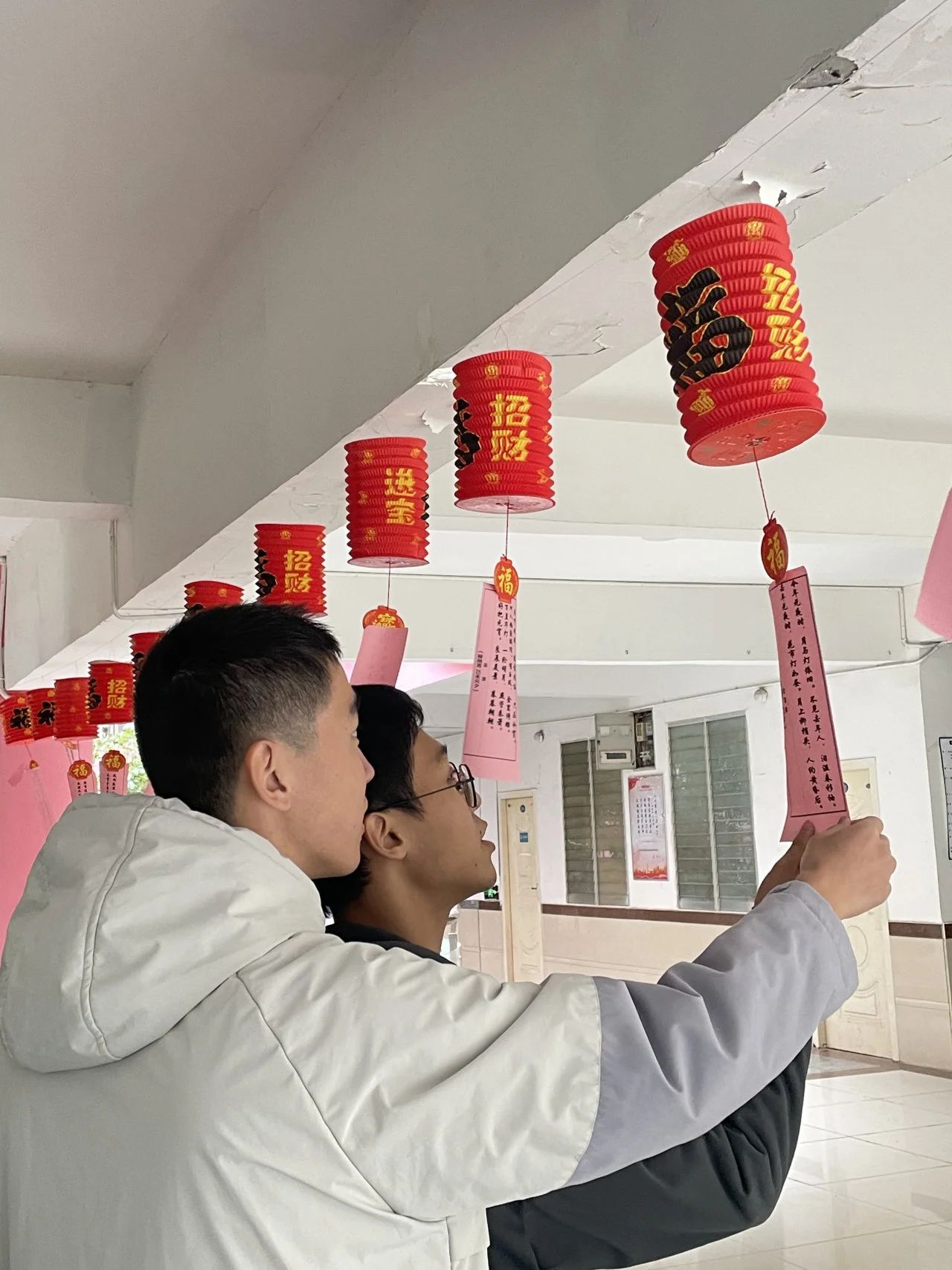 “弦管千家沸此宵,花灯十里正迢迢”灯笼是元宵节的重要元素,是喜庆吉祥的象征。趁着热闹的氛围,同学们通过材料包自行制作花灯,火红的灯笼装点了温馨的氛围,同时也照亮了他们对新年的美好期许和无尽的祝福。