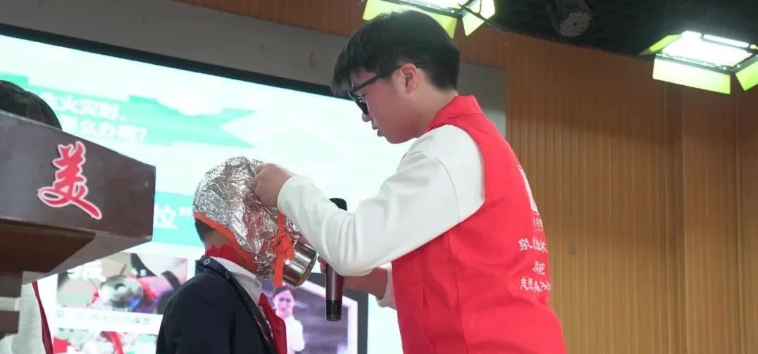 “大家知道在遇到火灾的时候,我们应该先报警还是先逃生呢?”宣讲团成员谢家翌的提问引发了现场小朋友们的思考,紧扣这个问题,他引出了“火灾逃生方法”,并联系实际案例讲解了火灾逃生的关键步骤,告诉小朋友们牢记“小火快跑,浓烟关门”。当宣讲团成员拿出防烟面具时,小朋友虽然不太清楚如何使用,但都表现出很大的兴趣,在宣讲团成员理论结合实操的讲解下,相信“开,拔,套,拉”四字口诀已经深深印在他们的脑海当中了。