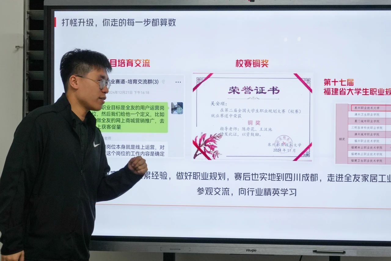 吴安顺同学结合自身经历进行分享。在课业学习上,他系统介绍了高效学习策略与知识梳理技巧,倡导同学们建立互助共进的良性关系;在课外实践上,他结合自身在多个学生组织、校外公司中的历练经历,建议同学们结合特长选择适合自己的岗位,在服务同学中实现能力进阶与价值提升。互动环节中,他针对学业规划、时间管理等普遍性问题提出解决方案,鼓励大家直面挑战、化压力为动力,打破思维定式,以行动力开拓成长空间。