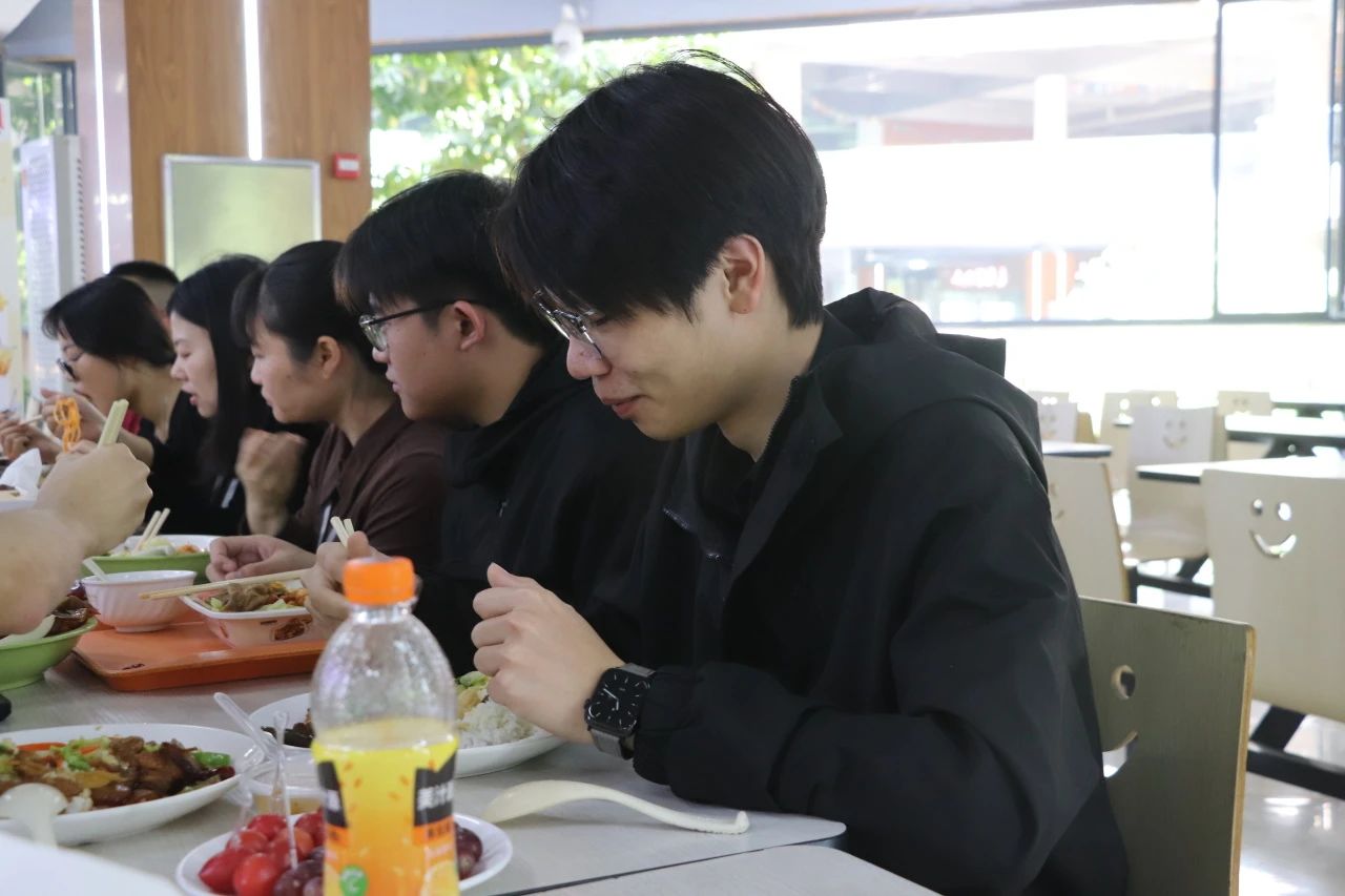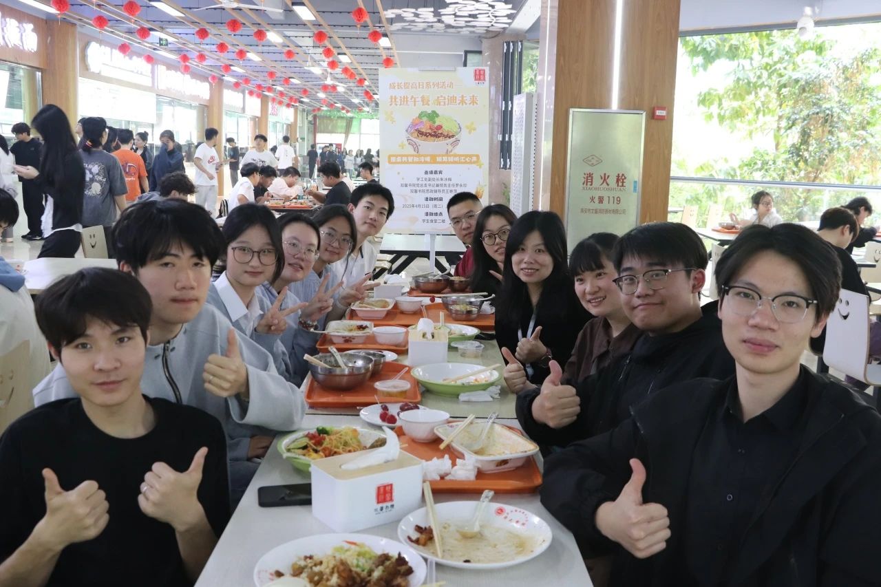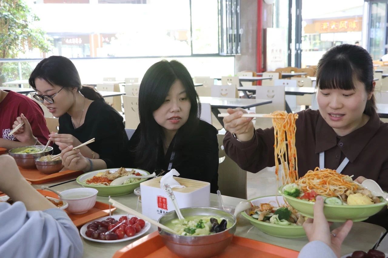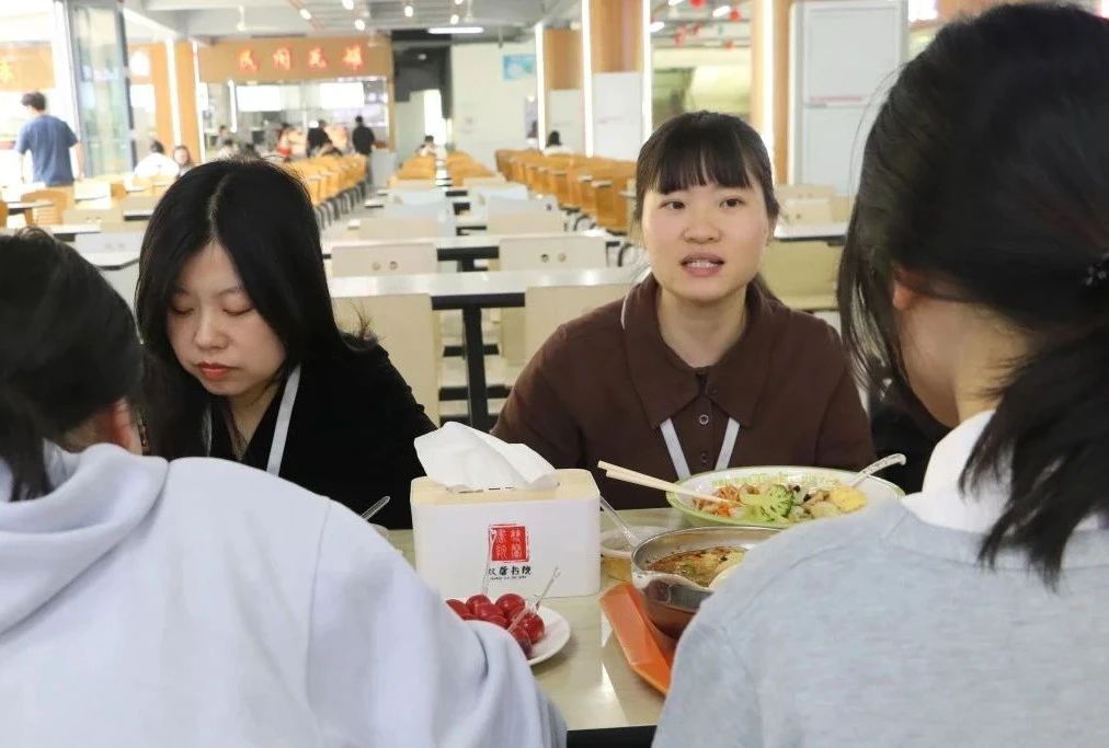 师生围坐在一起,食堂内弥漫着饭菜的香气,更洋溢着温馨和谐的氛围。大家一边享受着美味的午餐,一边向老师们分享在现状、规划、择业等学习工作中的疑问和在饮食、住宿、出行等日常生活中的实际需求。