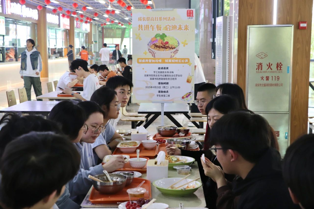 2025年4月15日,一场别开生面的午餐会在学生食堂二楼温馨开启。本次“共进午餐,启迪未来”活动,邀请到了双馨书院党总支书记兼院务主任罗永珍、学工处副处长朱冰梅、双馨书院思政辅导员王艳萍,与同学们一同共进午餐,展开了一场知心交流。