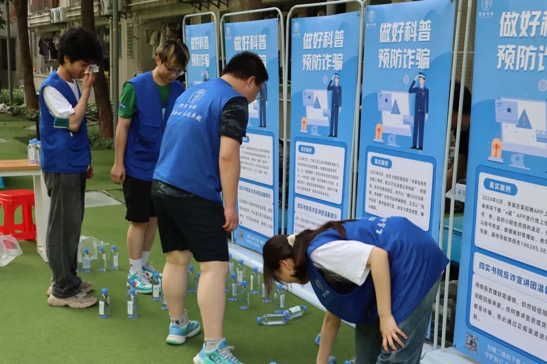 高帽踢毽子戴帽遮眼挑战平衡,滑稽互动成打卡热点,提升协调性;反诈保龄球足球击中诈骗标语水瓶,趣味强化反诈记忆。两者融娱乐与知识,促体质安全双提升。