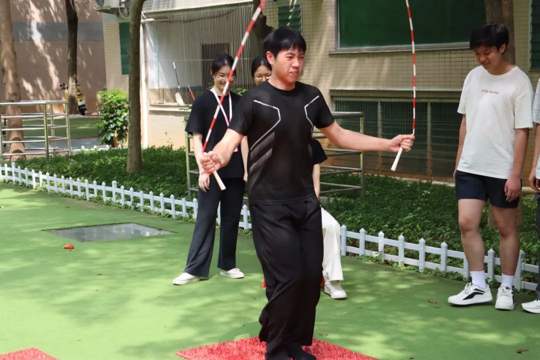 融合“指压板跳绳5次→乒乓球拍运球→大象鼻子转10圈→指压板返程跑”多重挑战,通过疼痛刺激与眩晕体验突破身体极限。活动将趣味游戏与耐力训练结合,既释放学业压力,又培养坚韧意志,过程中频发的欢笑与尖叫成为现场氛围催化剂。