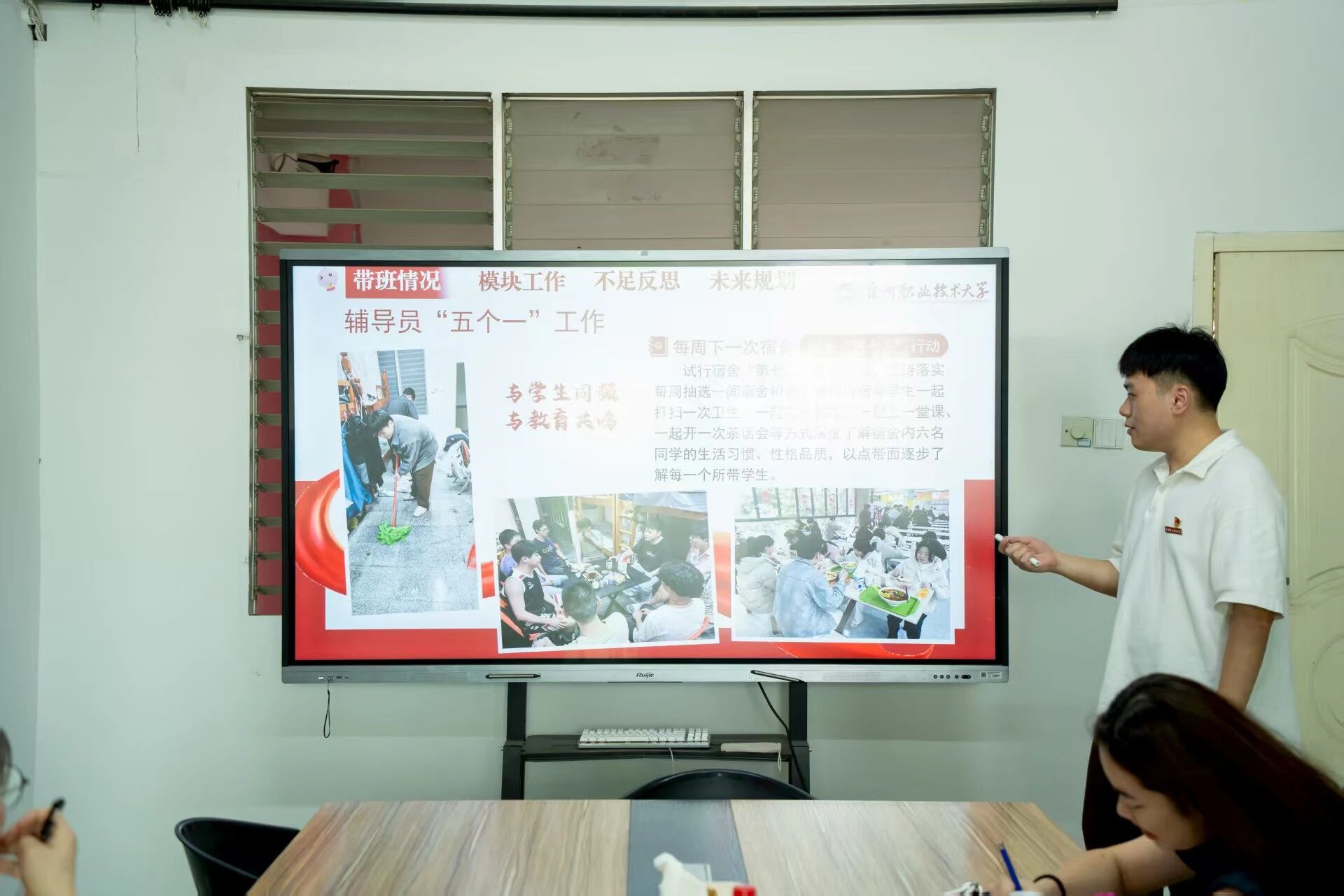林晓利老师从工作交接适应、学生日常管理、书院心理工作创新、资助工作探索等方面展开汇报。在班级管理上,围绕所带6 个班级、2个专业的整体学生情况形成基本数据盘;在心理工作上,依托心理工作四级体系,打造 “心理 +五育”活动;资助工作中,强调构建 “一队伍两方向三帮扶四步走” 的模式,精准赋能学生成长。汇报侧重于对下半年工作的规划,以班级动态赋能管理为抓手,将学生管理工作与“辅导员+”板块内容紧密结合,推动学生管理、心理辅导、资助帮扶深度融合,用心守护、用爱浇灌。