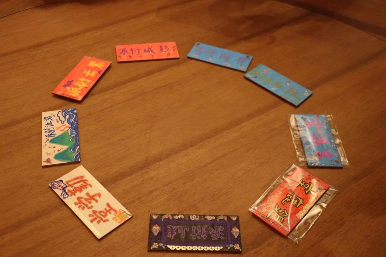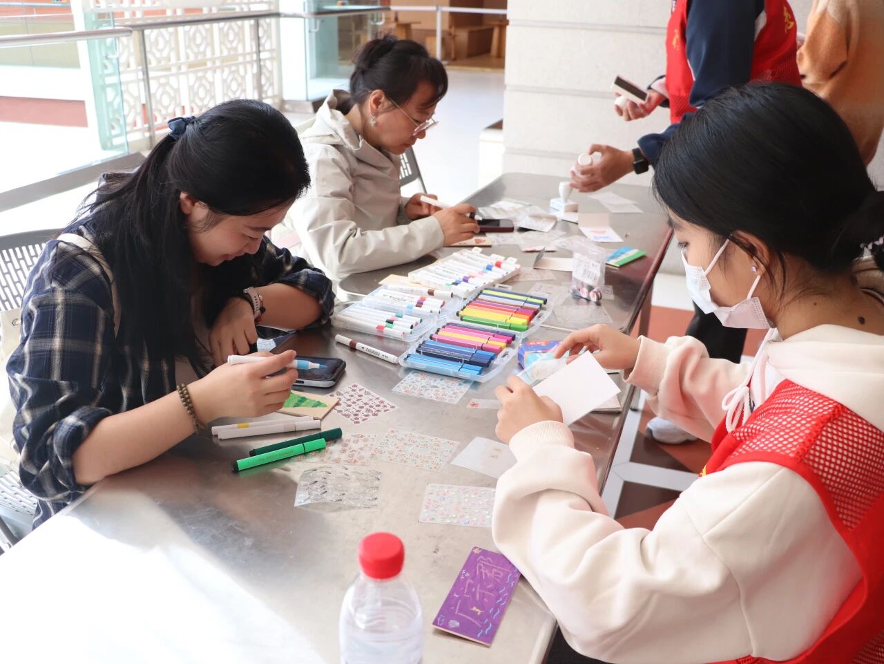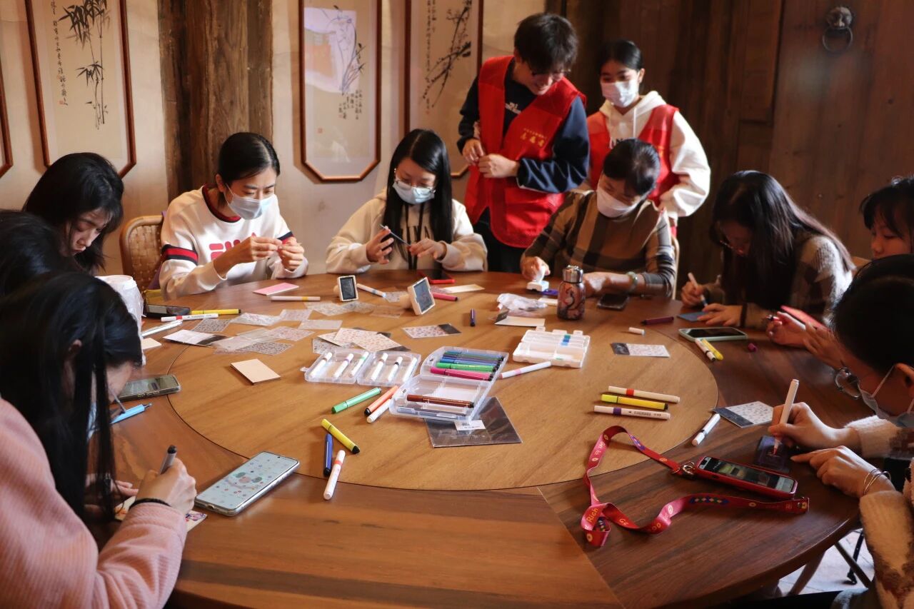 志愿者们围绕“堂号”展开引导:先帮游客确认自家姓氏对应的郡望堂号,比如为一位台湾同胞找到其家族“济阳蔡氏”的堂号参考;再协助大家挑选磁贴、调配颜料,手把手指导篆体堂号的勾勒技巧。有人专注复刻卡片上的传统堂号字体,有人则即兴添加简单线条装饰,原本空白的木板,渐渐成为承载家族符号的“迷你文化载体”,现场色彩与笑声交织,充满温情。