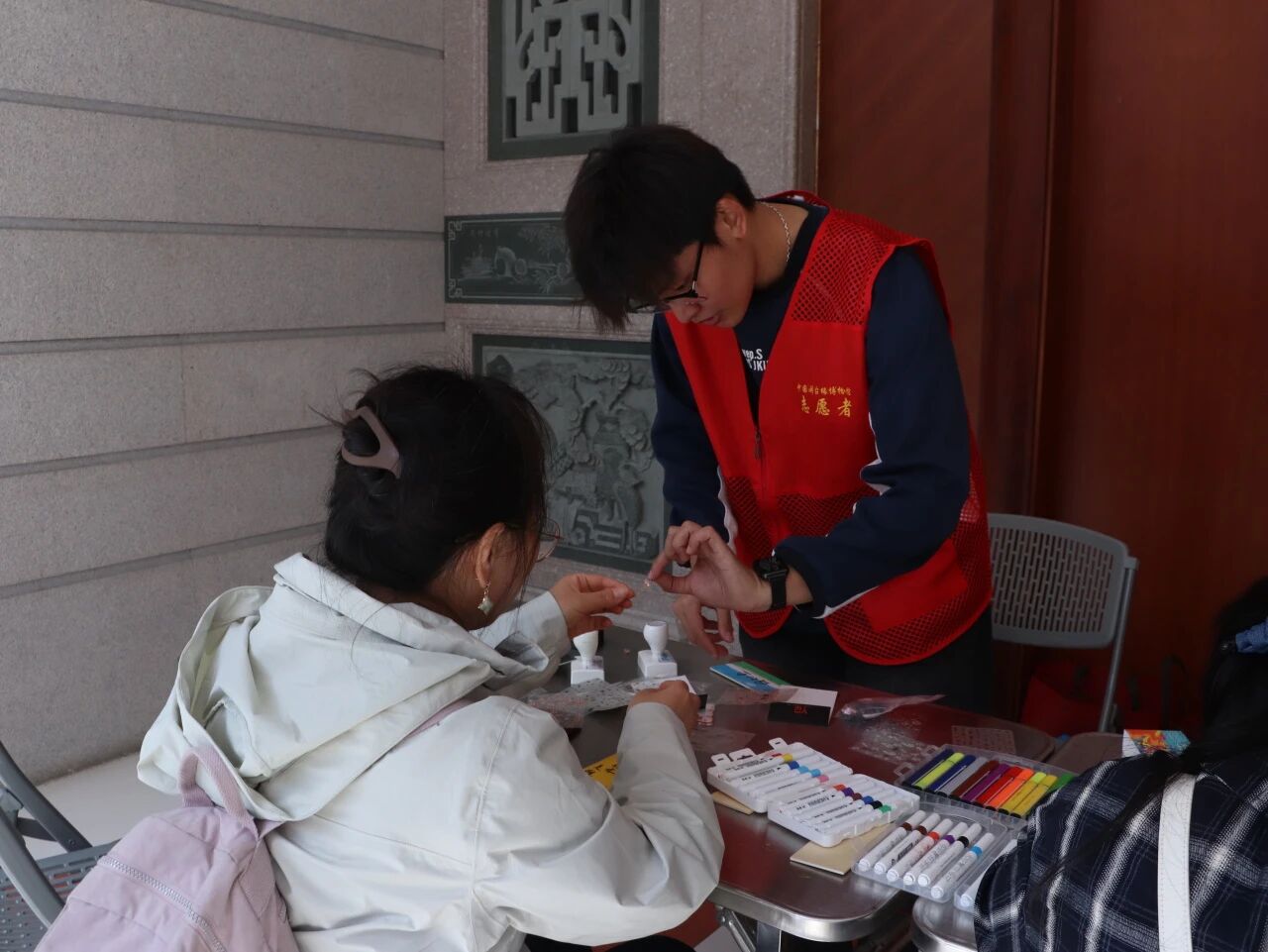 上午,闽台缘博物馆三楼互动区的摊位前已聚满游客,整个摊位聚焦“冰箱贴手绘”,简洁摆放着两大制作物料:一侧是大小一致的空白木板,多色彩的丙烯画笔、和排列整齐的磁吸贴片,满足不同绘画需求;另一侧则陈列着一些志愿者们的样品。