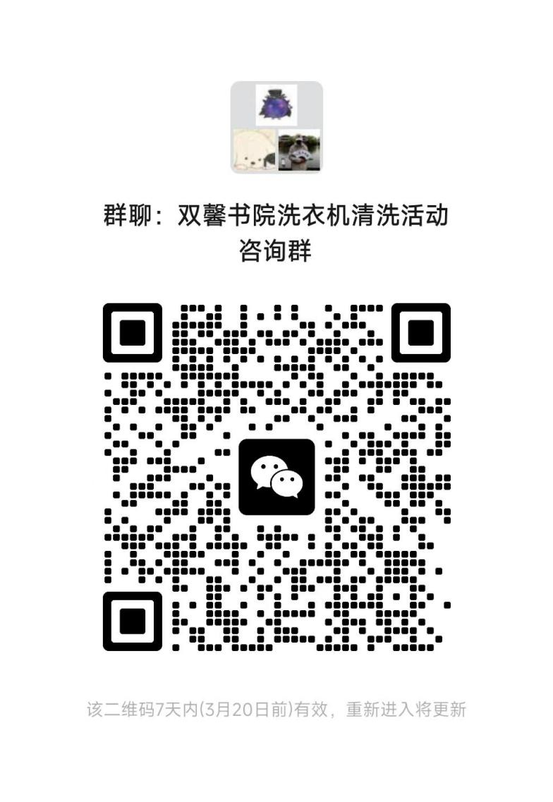 本次活动采取自愿报名的方式,有意向的宿舍均可报名参与。请同学们扫描下方报名二维码,填写宿舍号等相关信息完成报名。同时可加入活动咨询群,及时了解清洗安排、答疑解惑。我们将根据报名情况统一安排清洗时间,名额有限,先到先得,快来为你的宿舍预约一次彻底的洗衣机清洁吧!