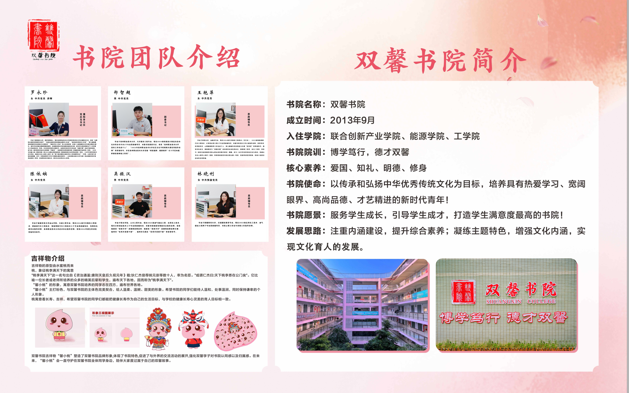 有关双馨 书院简介 师资团队 育人目标 规章制度 书院简介 当前位置: 书院首页 >> 有关双馨 >> 书院简介 双馨书院简介 书院名称:双馨书院 核心素养:爱国、知礼、明德、修身 书院院训:博学笃行,德才双馨 书院使命:以传承和弘扬中华优秀传统文化为目标,培养具有热爱学习、宽阔眼界、高尚品德、才艺精进的新时代青年! 书院愿景:服务学生成长,引导学生成才,打造学生满意度最高的书院! 发展思路:注重内涵建设,提升综合素养;凝练主题特色,增强文化内涵,实现文化育人的新发展。
