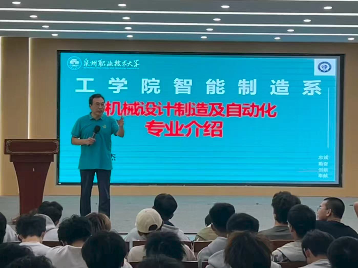 王荣杰教授以“为什么这么多大学开设机械专业?”为引,阐述了机械作为“制造业脊梁”的重要性。他结合晋江经验、区域产业需求,展示了专业在智能制造、机器人、新能源汽车等领域的广泛应用,并分享了学生在全国机械创新设计大赛、金相技能大赛中的优异成绩,激励新生“敢为天下先,爱拼才会赢”。