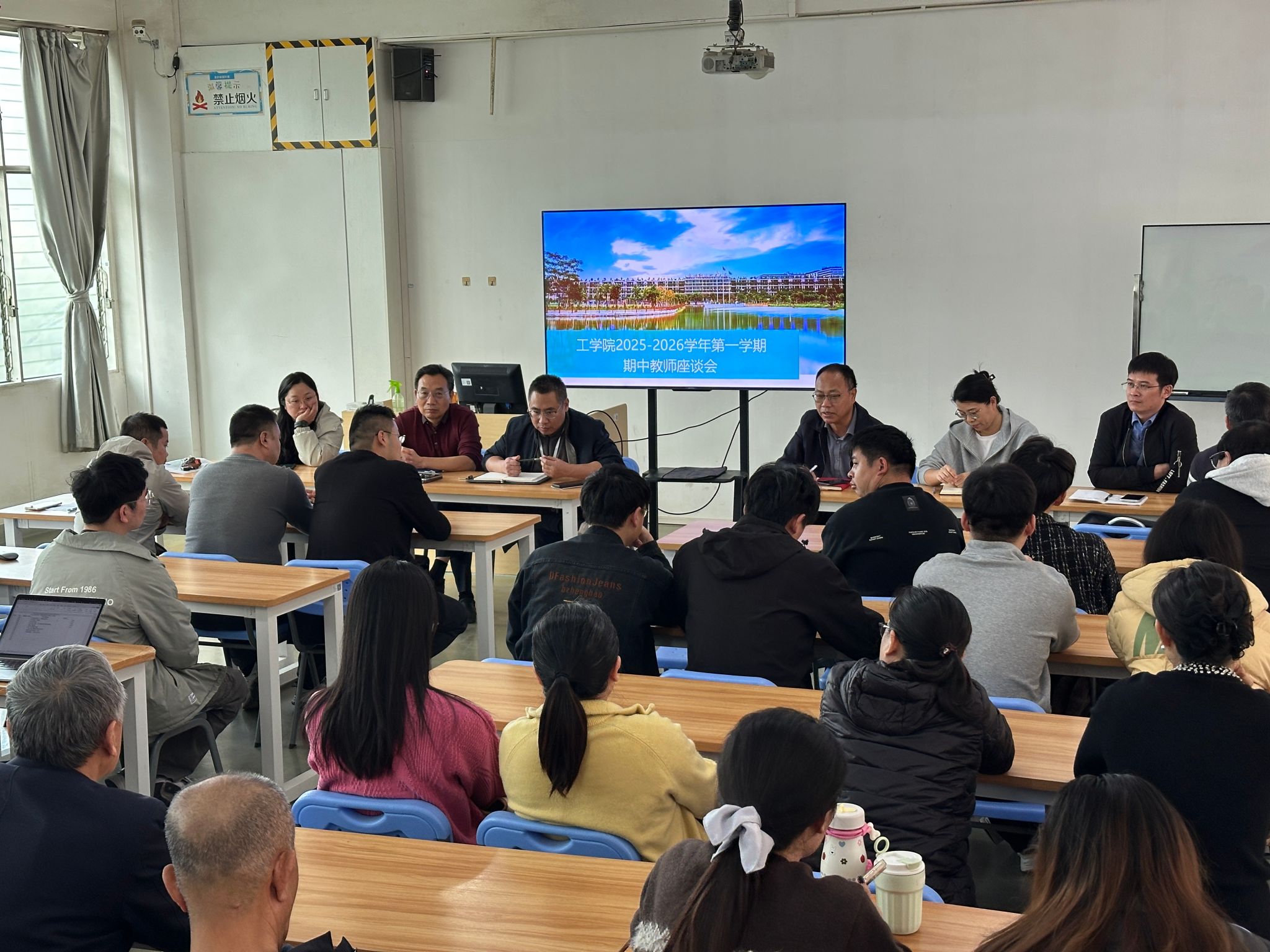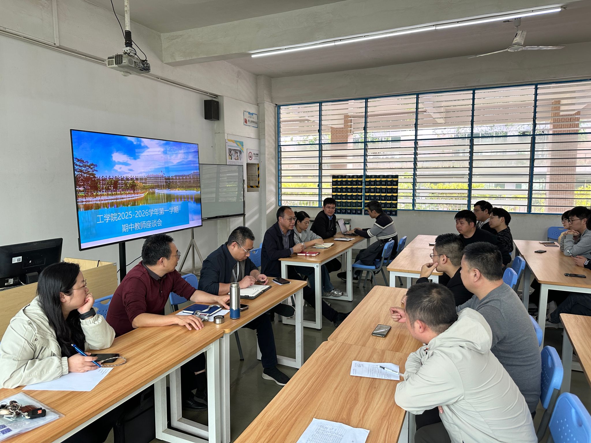 12 月 3 日下午 14:30,工学院在 B413 会议室召开期中教学检查教师座谈会。工学院党支部书记兼副院长陈其生、副院长蔡海毅,各专业负责人、行政秘书、教学秘书、实验员及全体专任教师参会,会议由陈其生书记主持,座谈会旨在全面总结上半学期教学工作成效与不足,部署下半学期教学任务。