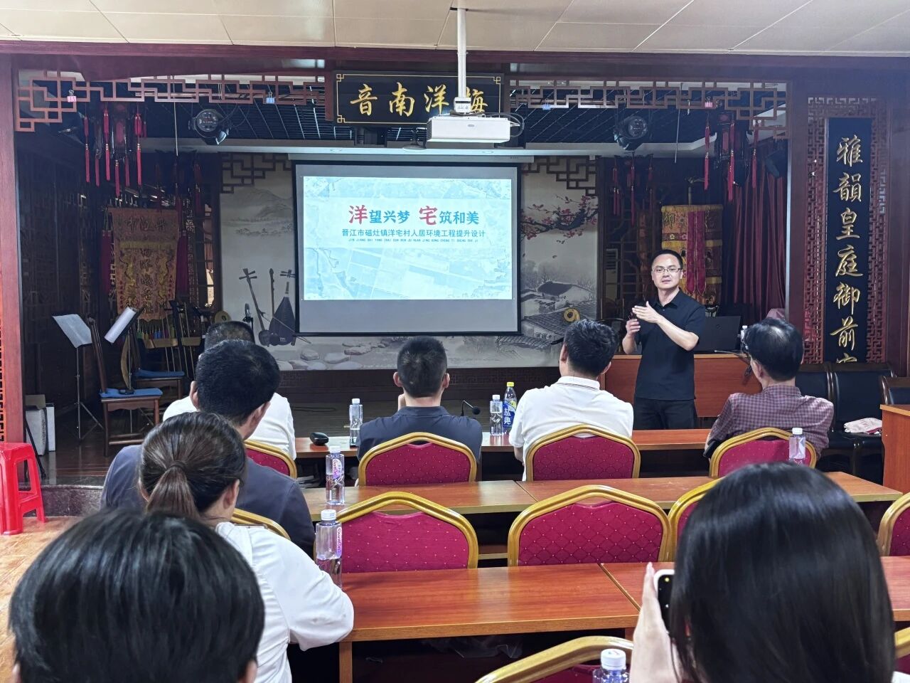 团队通过座谈、问卷与实地勘查,梳理洋宅村红色革命故事、古厝建筑及民俗文化资源,针对生态碎片化、公共空间不足等问题,提出“新产业·兴文化·欣生态”策略,将红色基因与家风家训融入整体规划,为后续设计奠定基础。