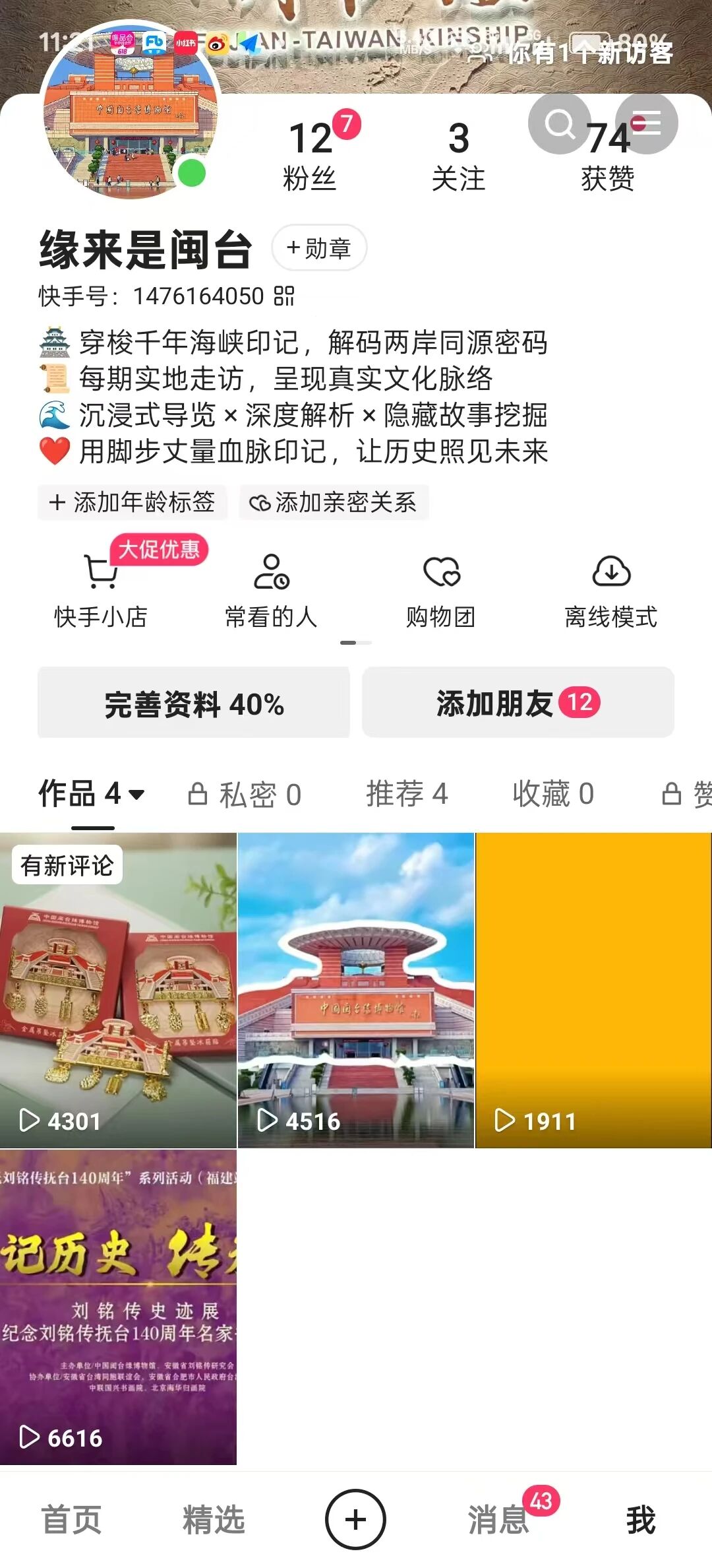 在两场“博物馆预览”直播中,主播廖同学与闽台缘志愿讲解老师雪伦默契配合,沿展厅陈列顺序从远古时期的台湾海峡古菱齿象化石,到明清时期的迁台路线图,再到抗日时期的台湾少年团史料,层层深入讲解闽台同源的历史脉络,还通过“体验渡海VR场景”、“近距离展示铁钟纹饰” 等环节打破时空限制,让观众沉浸式感受文物背后的故事,其中 7 月 31 日的直播表现尤为亮眼,曝光量达4272人,评论人数205人,新增粉丝 108 人,多项数据远超同级别文化类直播,成为平台内“文博云游”的优质案例;而在两场“文创分享”直播中,团队聚焦博物馆文创产品的文化内涵,从德化白瓷玉漱公主冰箱贴的珐琅工艺,到“同文同种同根生” 爆破画冰箱贴的木质肌理,再到“事事如意”纪念章的吉祥寓意,细致解读文创产品与文物、民俗的关联,同时创新设计 “观众点单讲解” 环节,根据弹幕需求优先介绍热门产品,搭配打卡套装视频展示,让文创成为传递闽台文化的 “便携载体”。