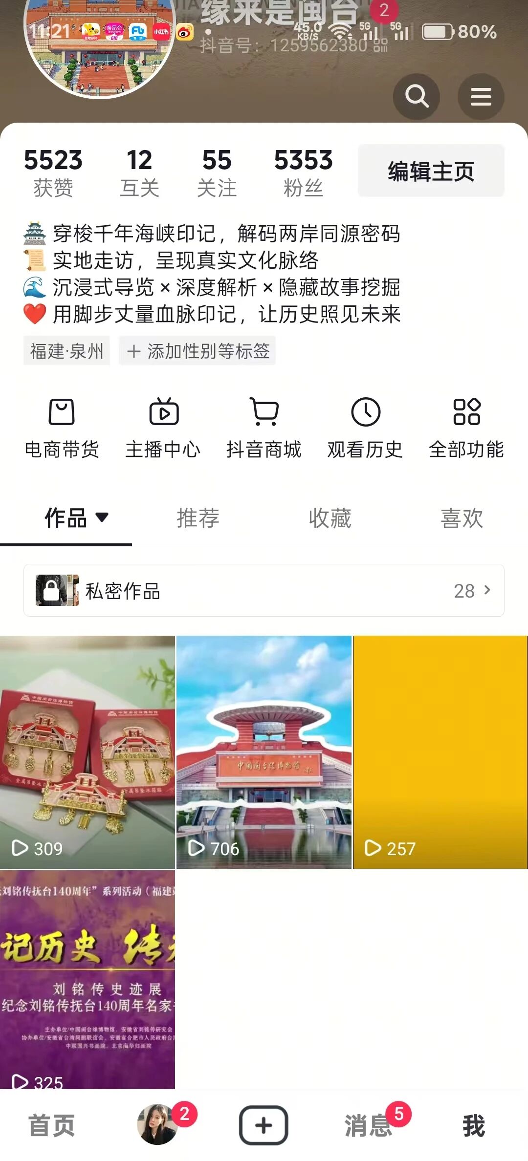 7月29日至8月7日,实践团先后开展4场直播,累计时长超8小时,以“预览博物馆+文创分享”双主题形式,带领观众“云逛”闽台缘博物馆。