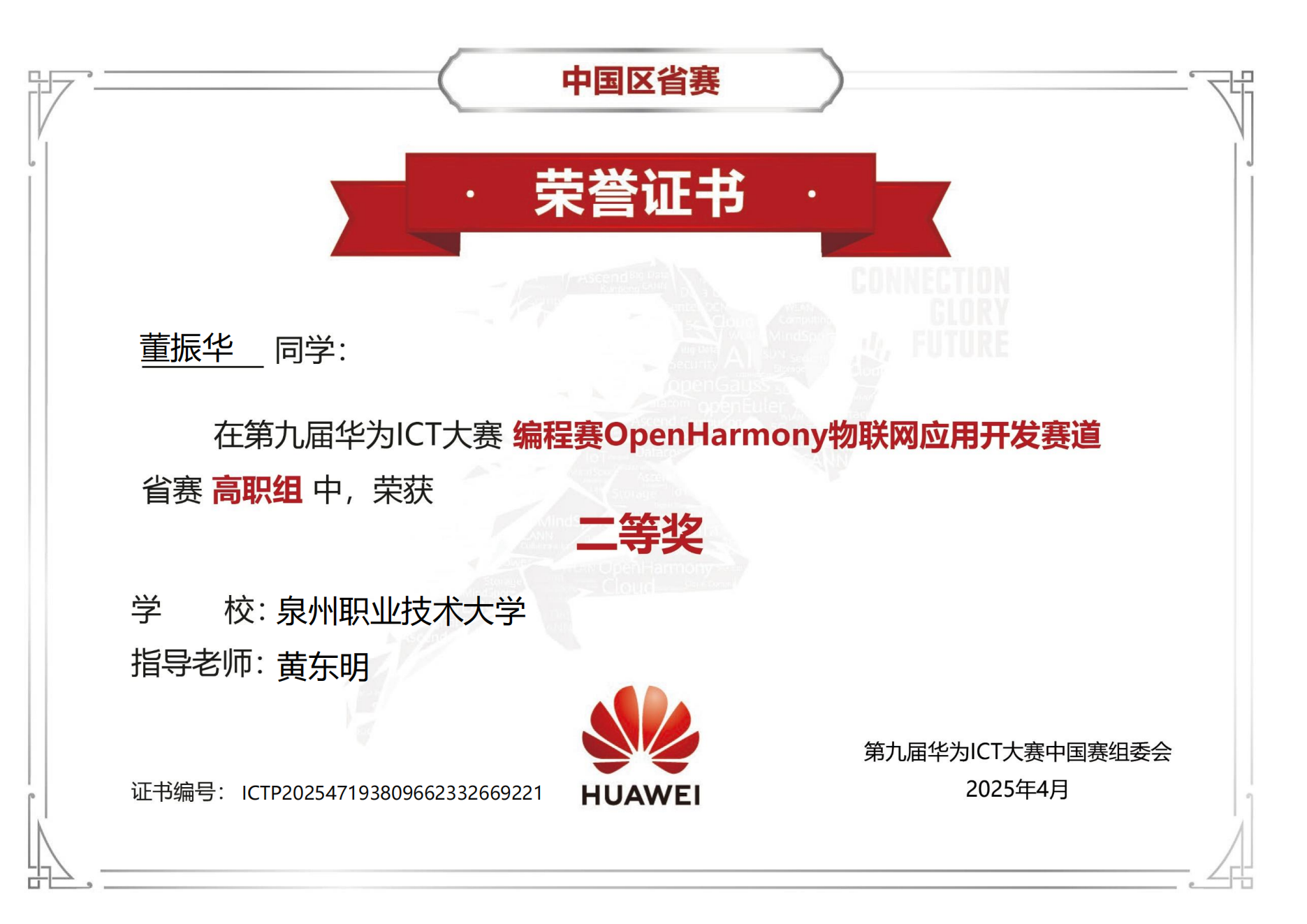 2025年04月 福建省第九届华为ICT大赛二等奖;