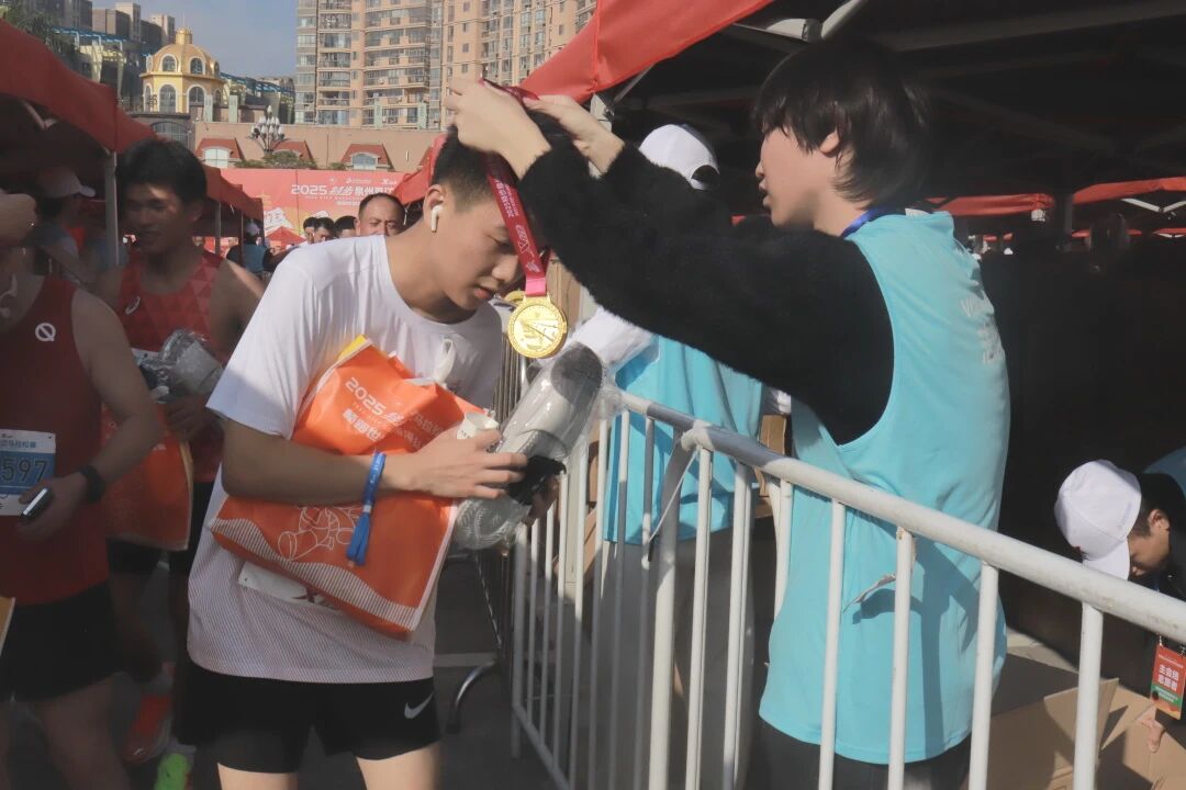 志愿者们提前将完赛奖牌、能量补给、纪念证书分类打包,待选手冲线后,迅速核对信息并精准发放。同时主动搀扶体力透支的参赛选手,鼓励拥护着走出赛场。他们用细致周到的服务,为每位完赛选手的追梦之程,送上温暖的收官仪式感。