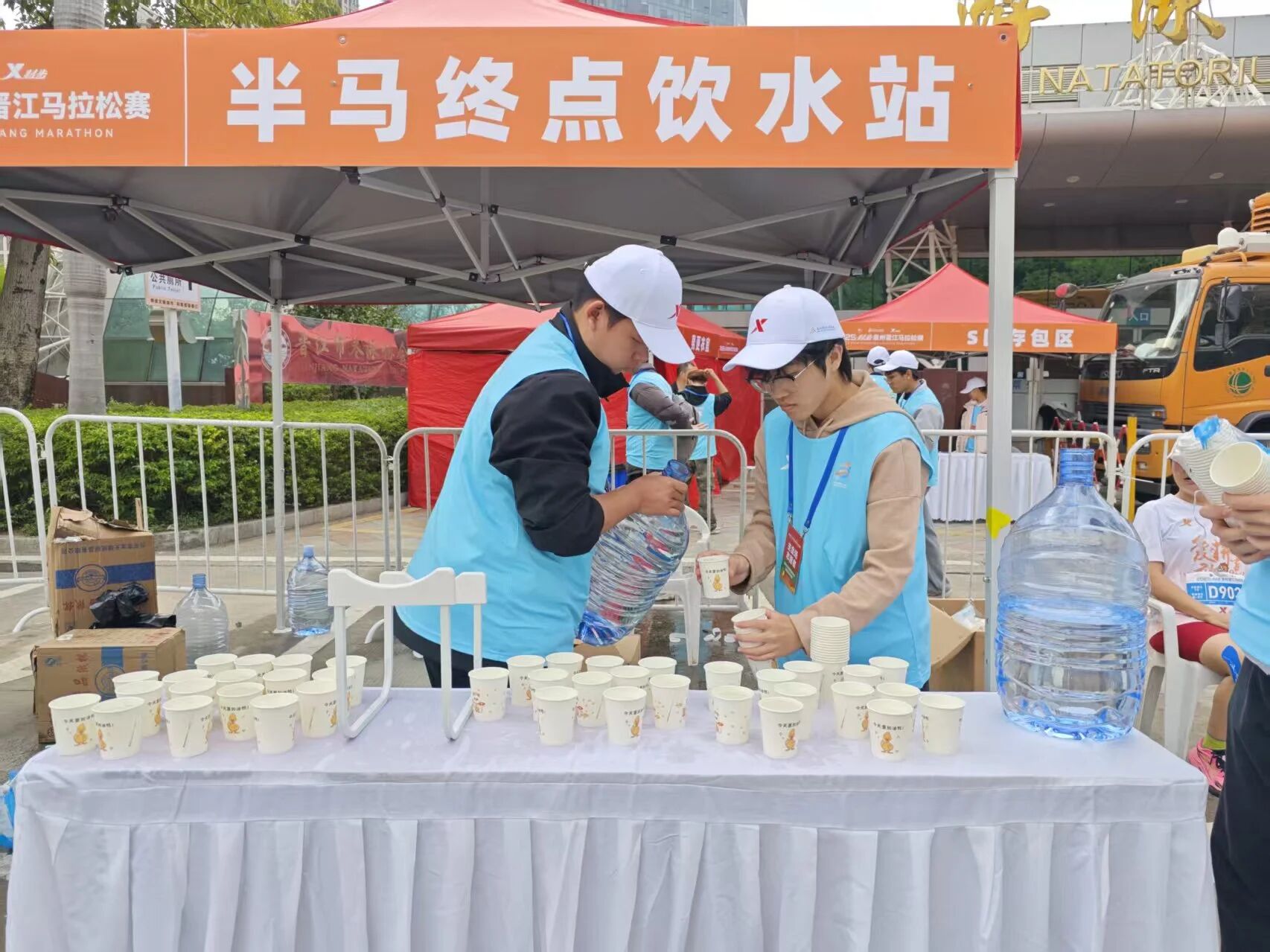 12名志愿者驻守赛道6个喷淋点位,及时为运动员更换桶装水,用清凉水雾缓解运动员疲惫,助力他们保持最佳状态。