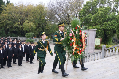 烈士纪念碑巍然矗立,全体师生神情庄重。仪式开始,泉大校卫队礼兵迈着铿锵有力的步伐,向纪念碑敬献花圈。缎带上“革命烈士永垂不朽”八个大字庄重而醒目。