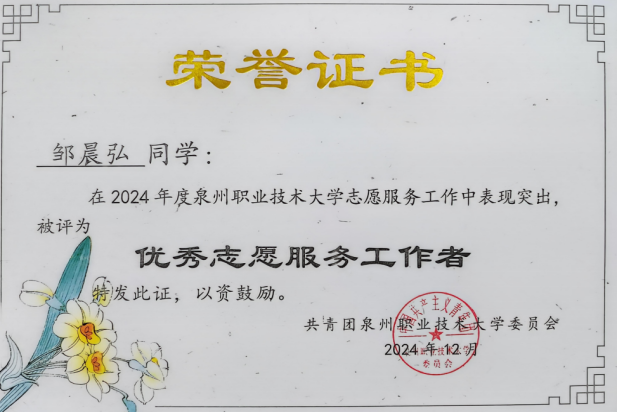 2024年12月 泉州职业技术大学 优秀志愿工作者荣誉称号;