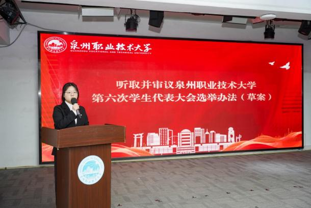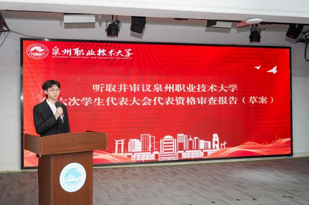 泉州职业技术大学第五届学生会主席团成员林煊炫代表泉州职业技术大学第五届学生会向大会作《挺膺担当新征程,服务赋能向未来,团结带领广大泉大学子为建设特色鲜明、区域领先的职业本科高校贡献青春力量》的工作报告。报告全面回顾了第五届学生会在思想引领、服务同学、校园文化建设、自身建设等方面的工作成效,深刻总结了经验启示,并围绕学校发展目标与同学成长需求,明确了新一届学生会的工作方向与重点任务。