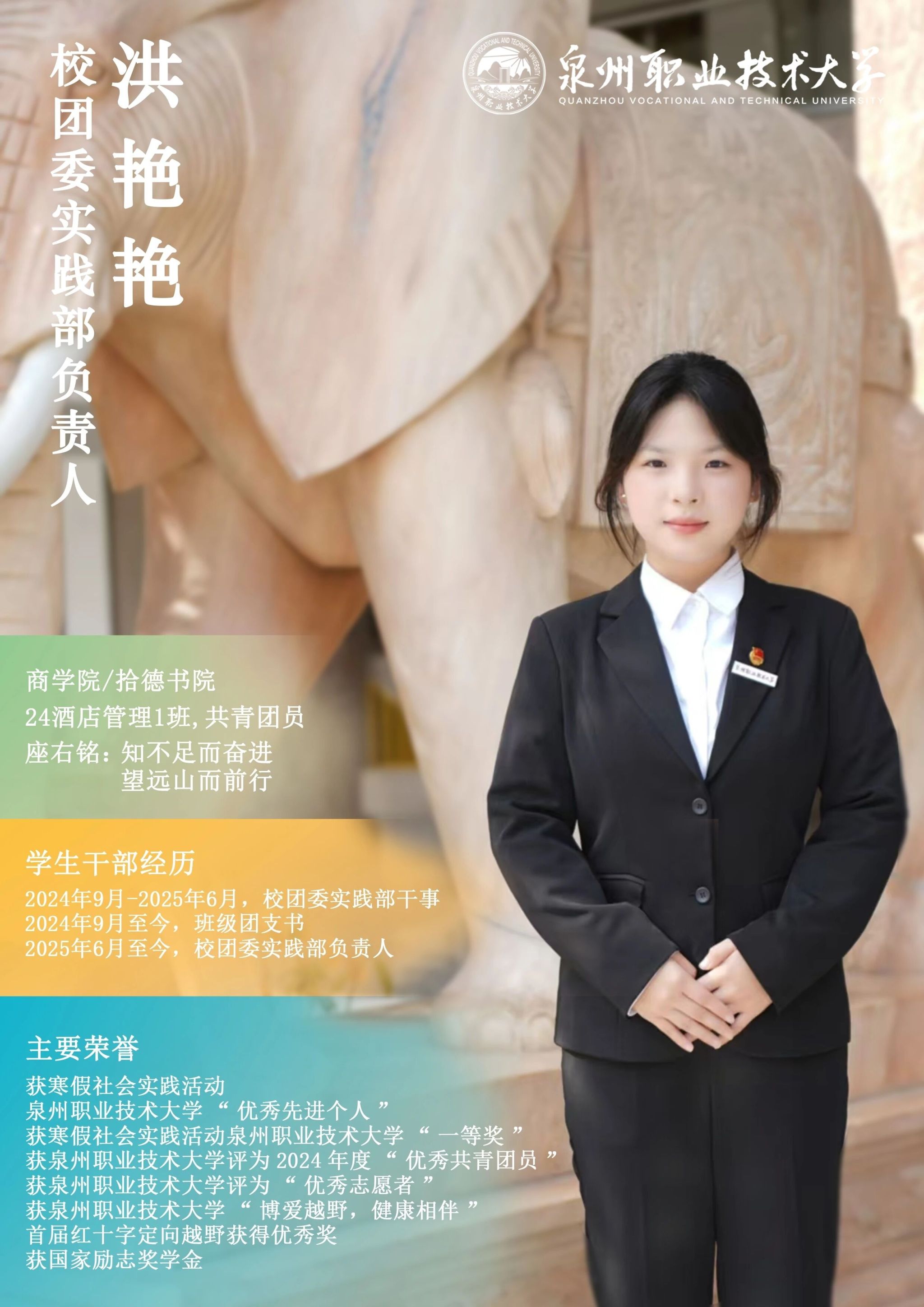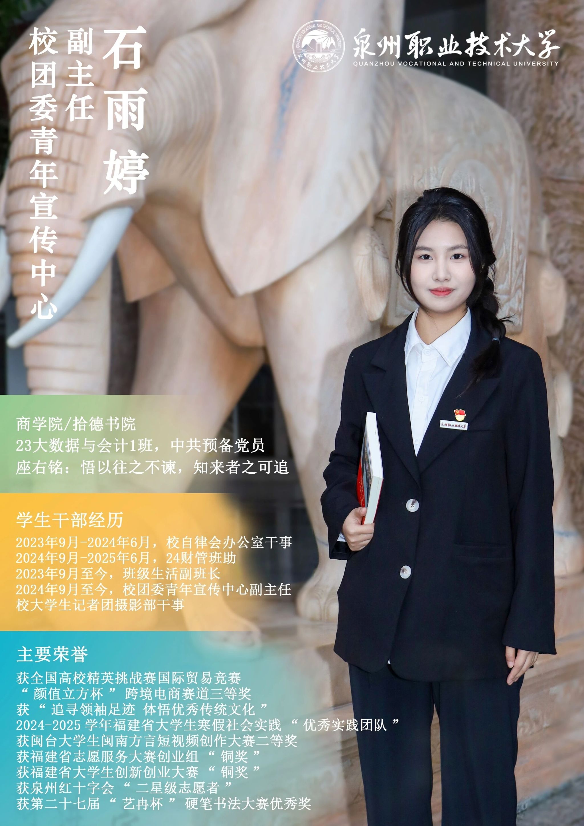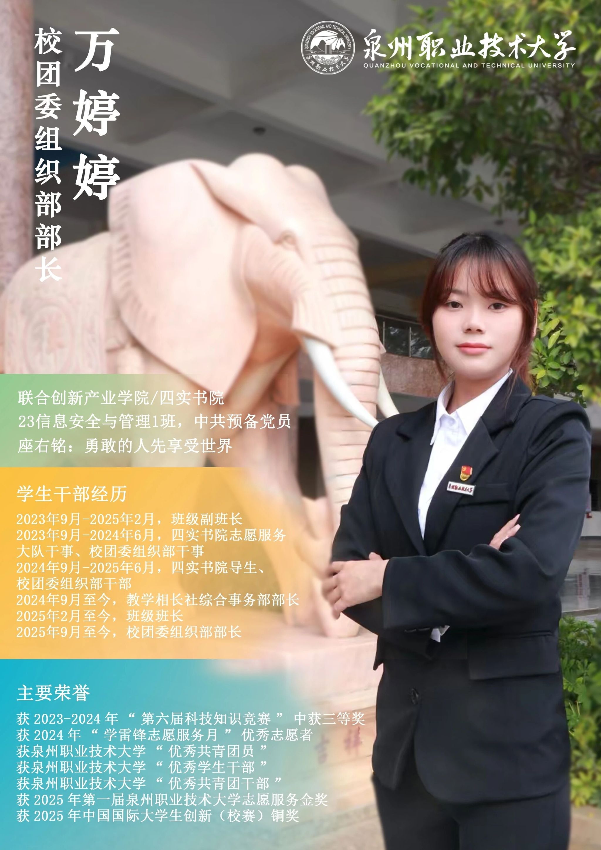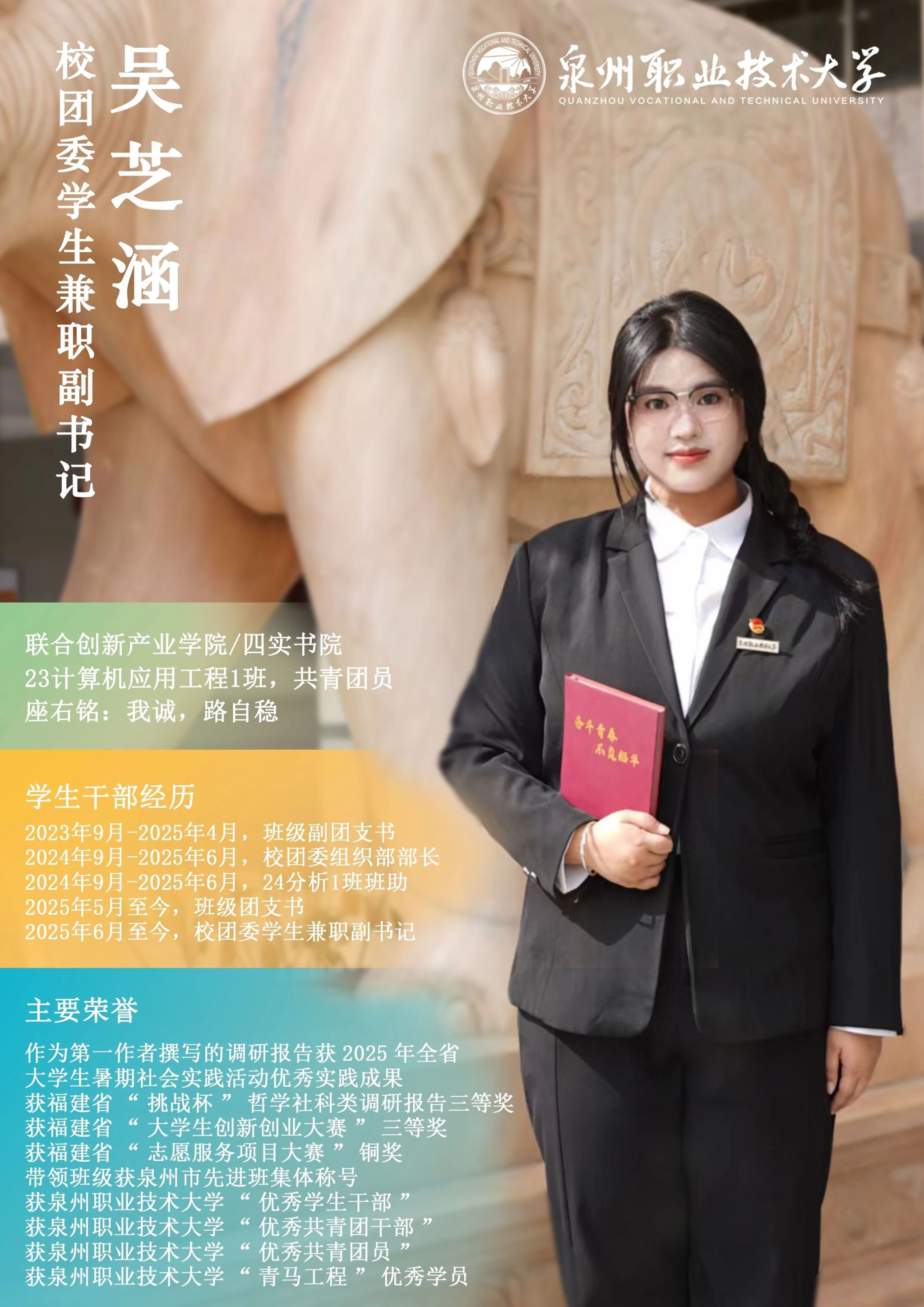 学校团委推出校级学生骨干“亮身份·树形象·做表率”专栏展示,要求学生骨干带头学习提高、带头争创佳绩、带头服务同学、带头遵纪守法、带头弘扬正气,充分发挥先锋模范作用与桥梁纽带作用,请广大师生共同监督。