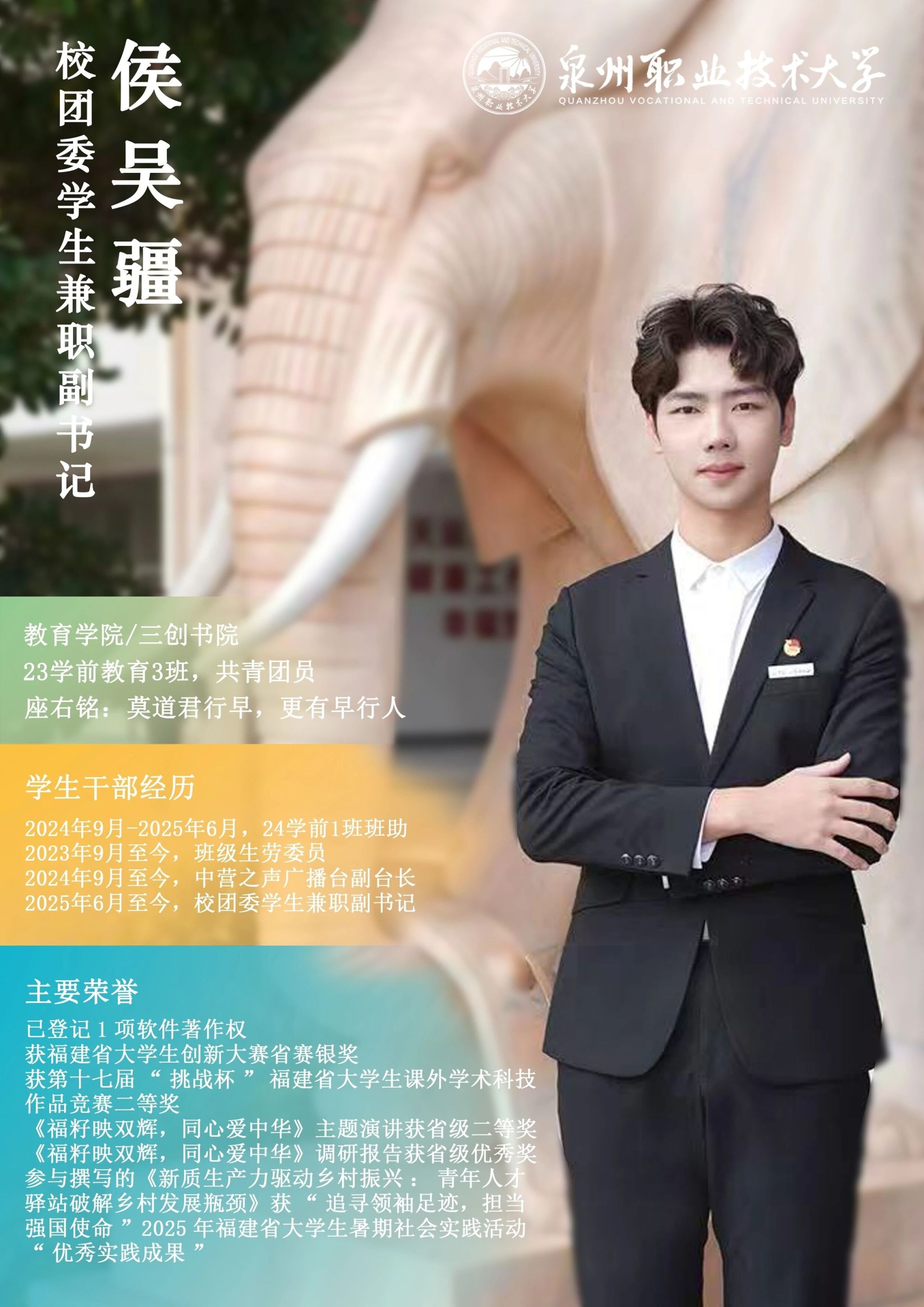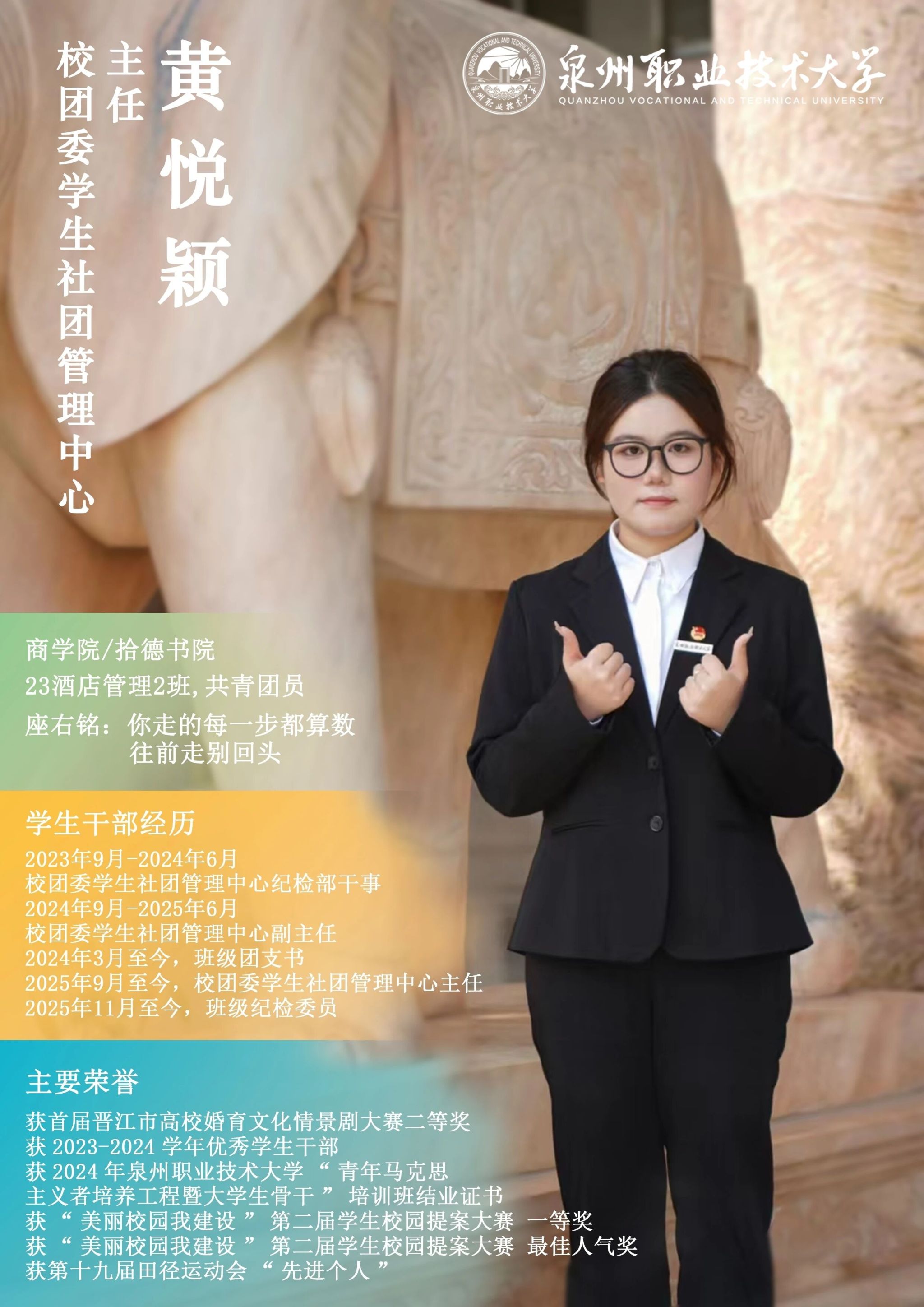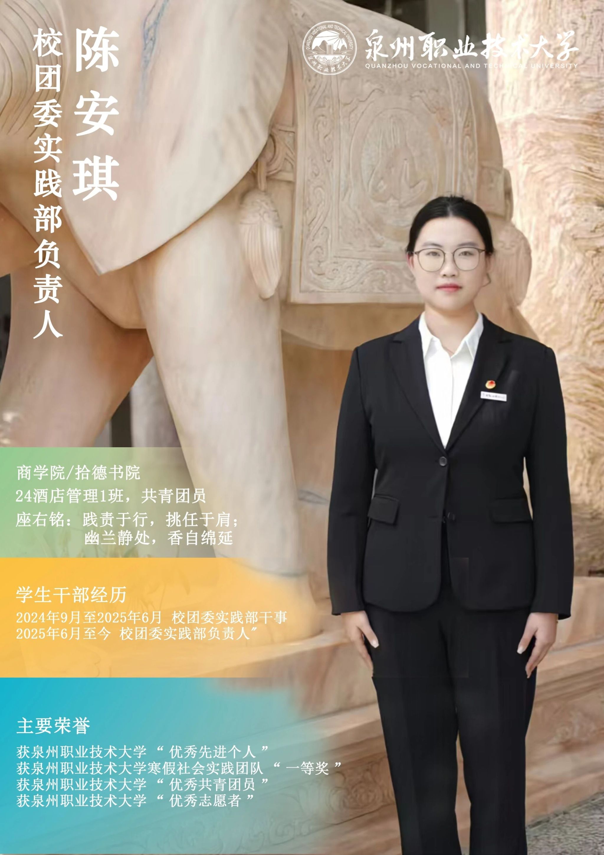 学校团委推出校级学生骨干“亮身份·树形象·做表率”专栏展示,要求学生骨干带头学习提高、带头争创佳绩、带头服务同学、带头遵纪守法、带头弘扬正气,充分发挥先锋模范作用与桥梁纽带作用,请广大师生共同监督。