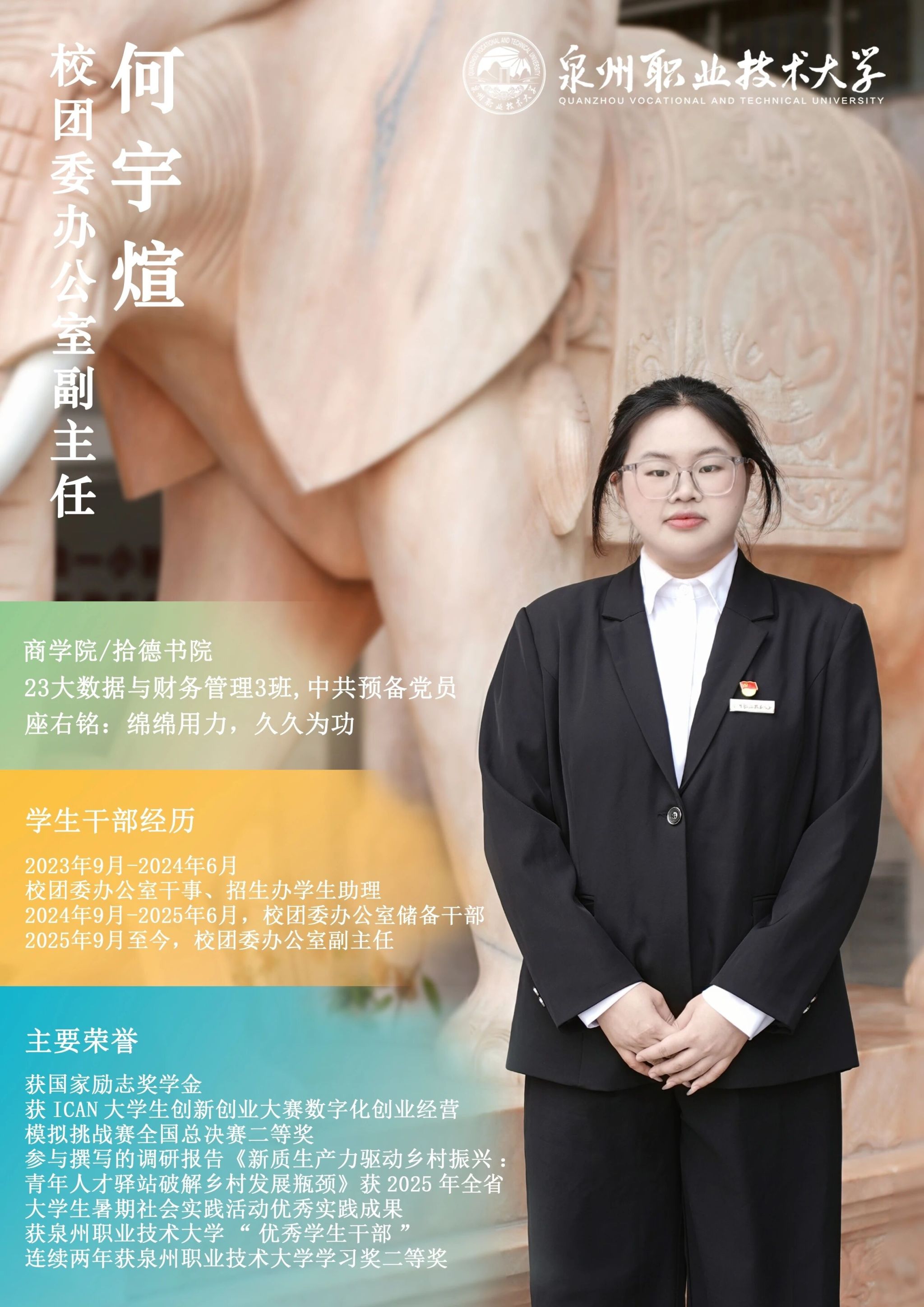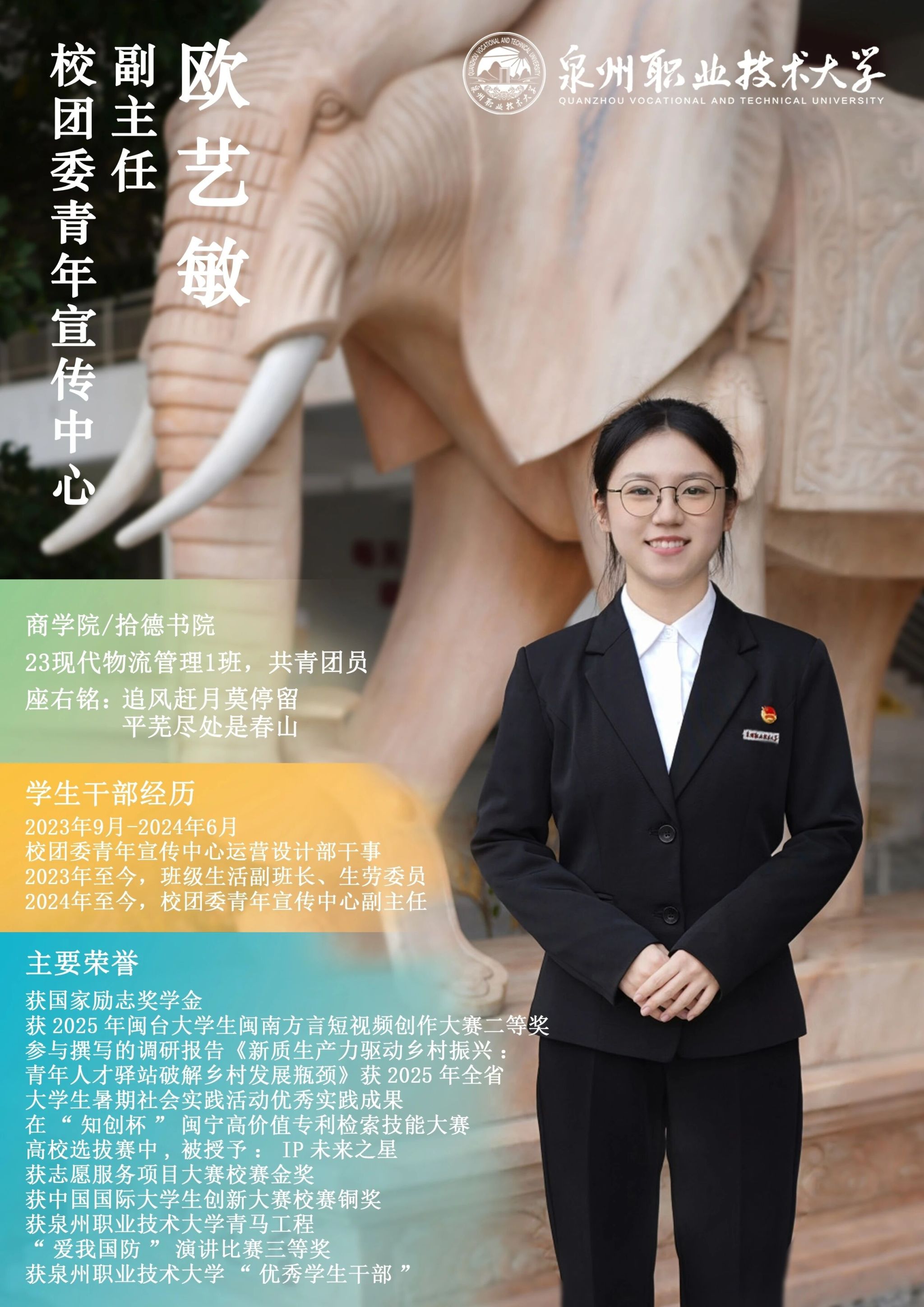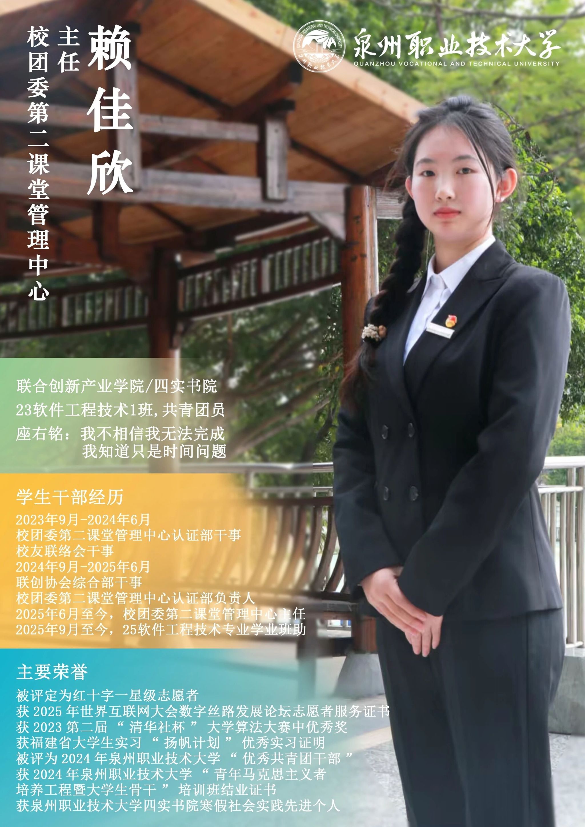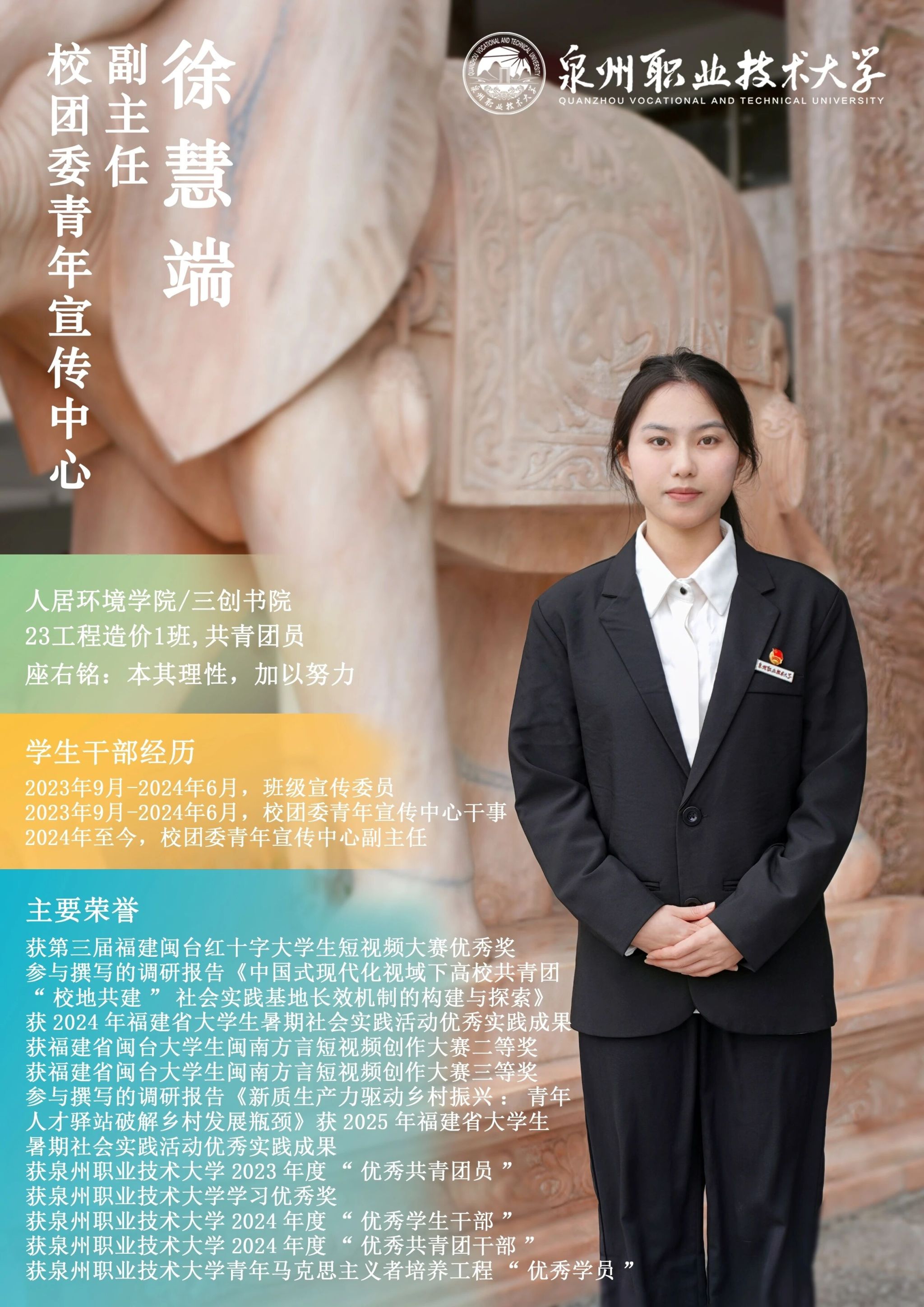 学校团委推出校级学生骨干“亮身份·树形象·做表率”专栏展示,要求学生骨干带头学习提高、带头争创佳绩、带头服务同学、带头遵纪守法、带头弘扬正气,充分发挥先锋模范作用与桥梁纽带作用,请广大师生共同监督。