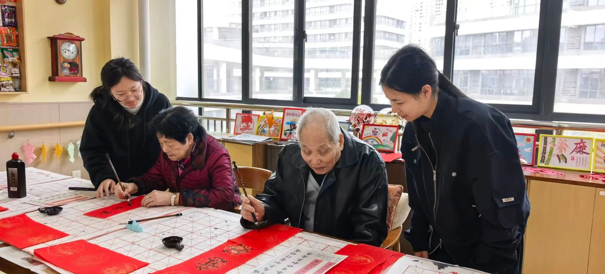 ▲ 爷爷奶奶教学生写春联、毛笔字