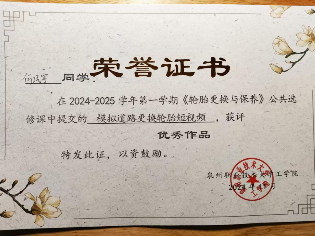 2024年11月 轮胎更换与保养,模拟道路更换轮胎短视频,获评优秀作品;