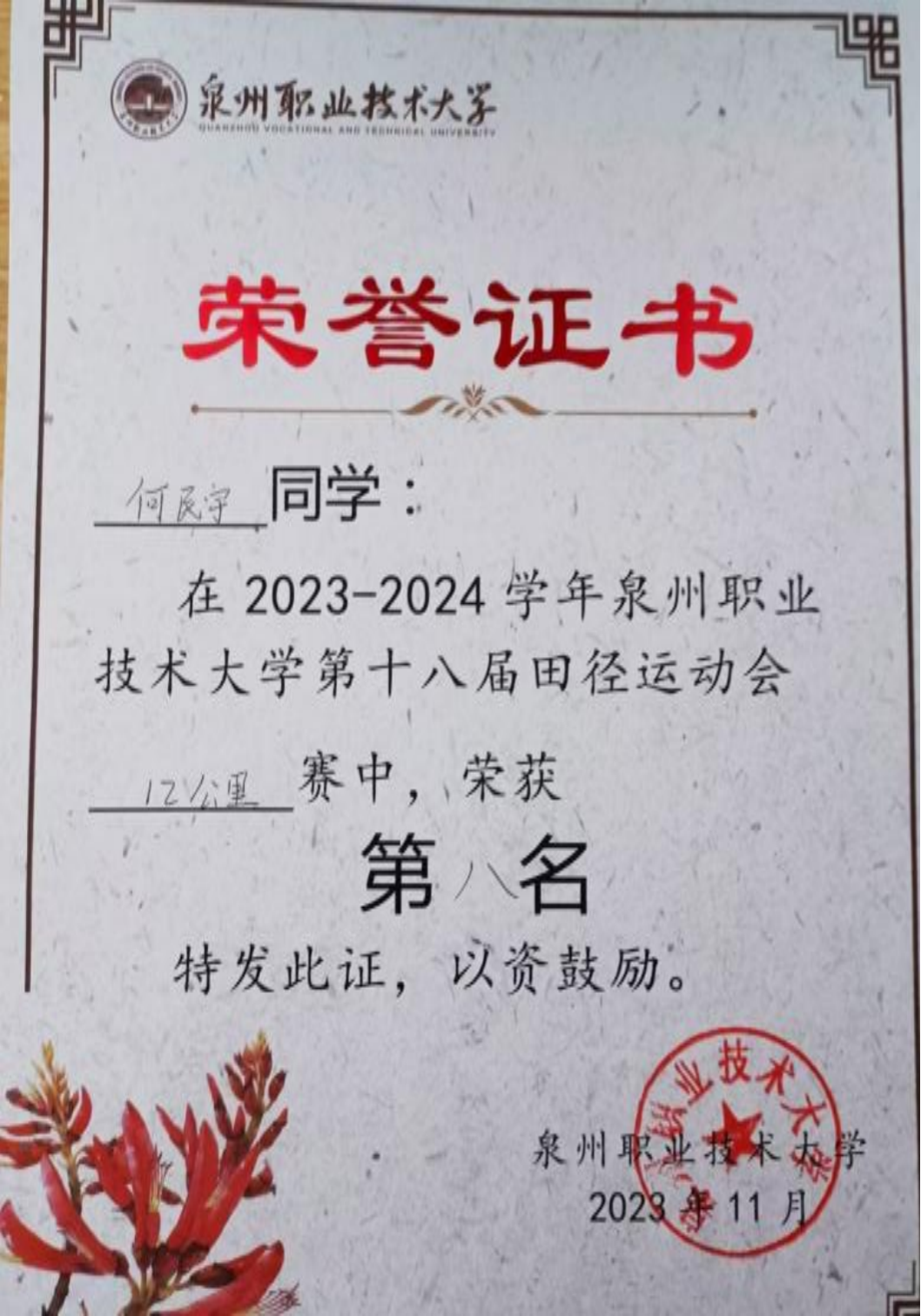 2023年11月 泉州职业技术大学 第七届体育文化节暨第十八届田径运动会“12公里”第八名;