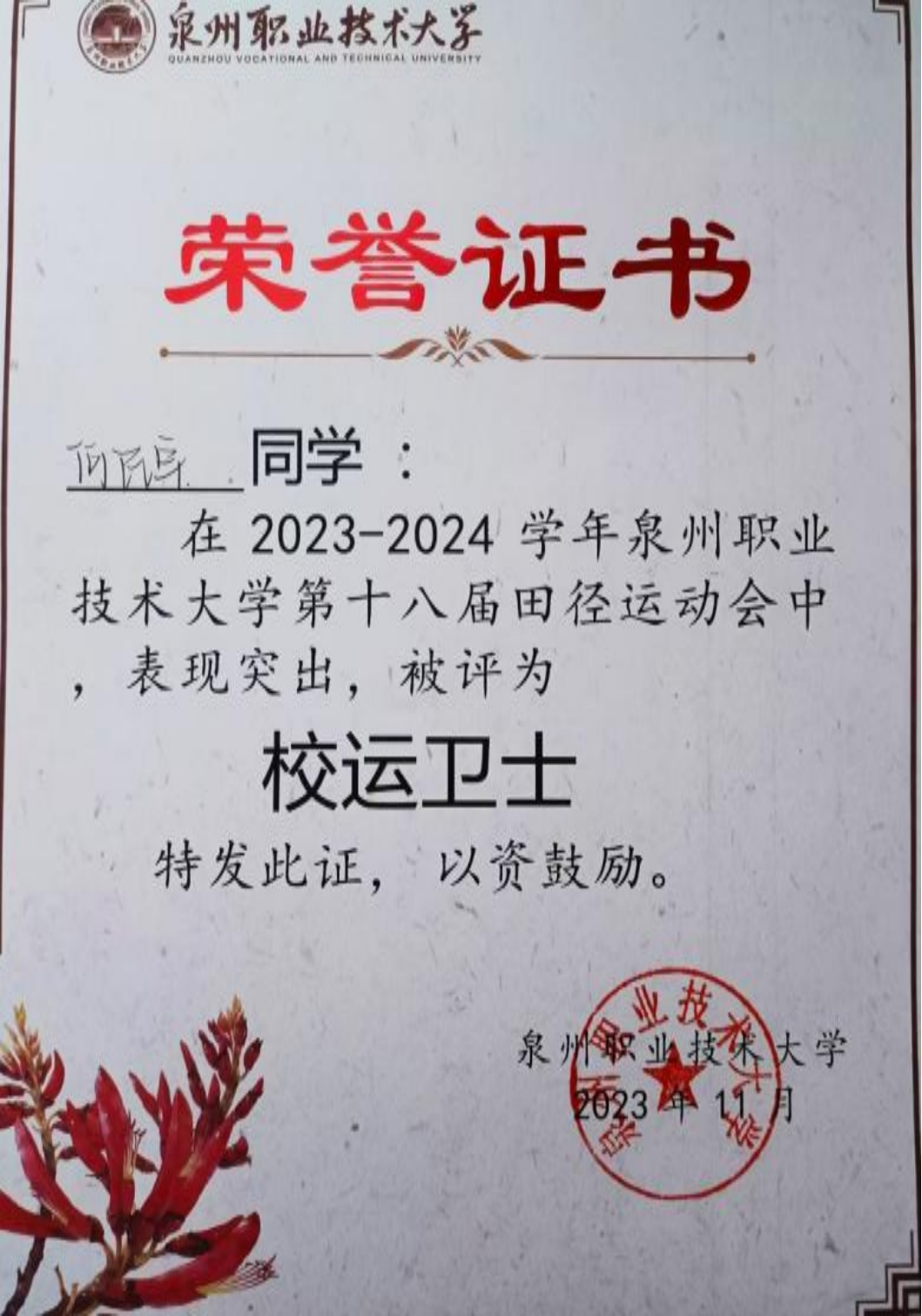 2023年11月 泉州职业技术大学 第七届体育文化节暨第十八届田径运动会“校运卫士”称号;