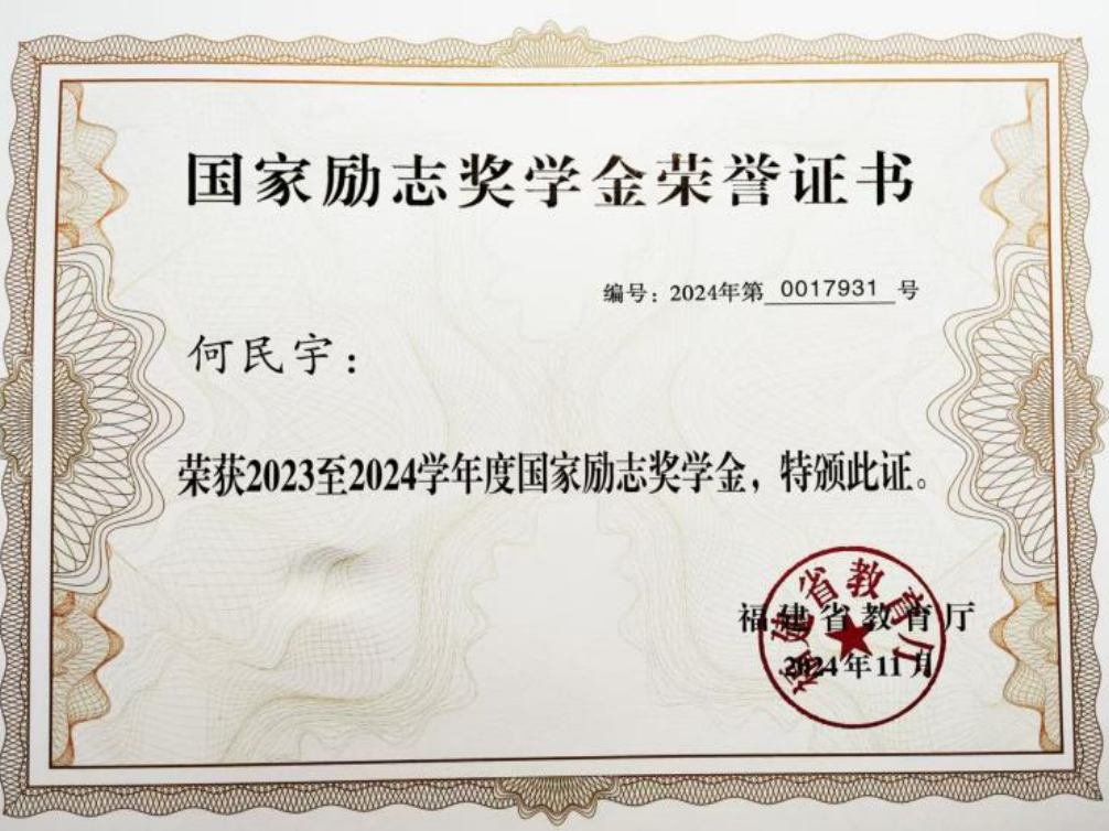 2024年11月 “国家励志奖学金”;