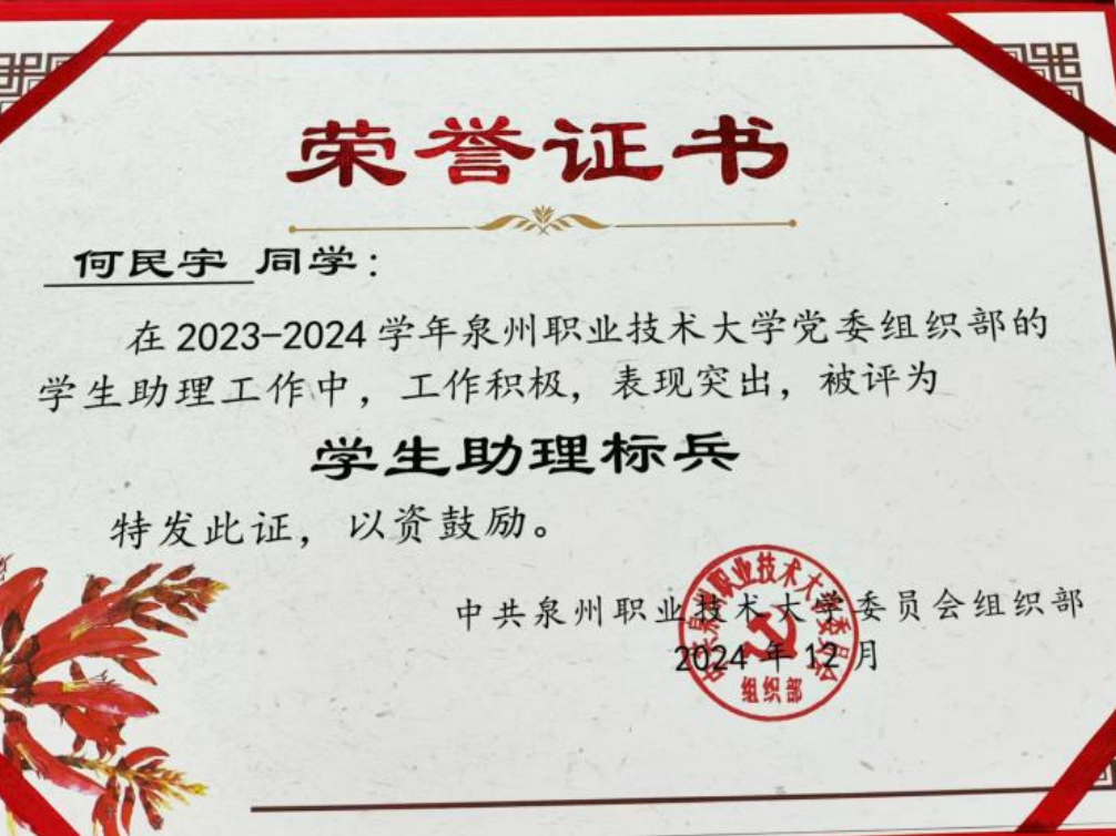 2024年12月 泉州职业技术大学“学生助理标兵”;